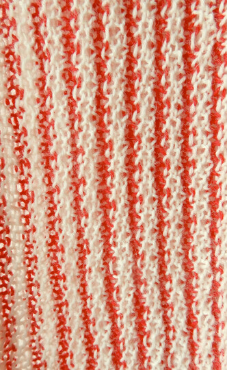 Garn: Lang Yarns Jawoll Superwash 75/25 (75% Wolle, 25% Nylon; 209m/50g), 2 Knäuel in Farbe 1 (weiß) und 1 Knäuel in Farbe 2 (rot). Verbrauch für das Beispiel mit 11 Musterwiederholungen: 260m von Farbe 1 und 71m von Farbe 2.
