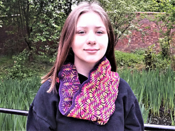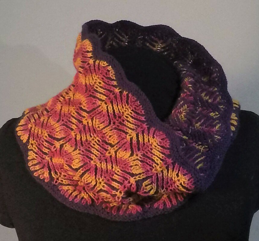 Gestrickt wird im Patentmuster auf einer Rundstricknadel. Die Abnahmen sind diejenigen , die für Patent in der Runde gelten. Diese sind einfacher als beim normalen Patent und ähneln denen des normalen Strickens , außerdem werden sie über drei Runden verteilt und liegen deswegen viel flacher , als beim Patent , sonst üblich ist. Da ich in der Literatur keine entsprechende Abnahme für vier Maschen finden konnte habe ich eine doppelte Abnahme mit obenauf liegender Mittelmasche mit Umschlag gemacht und festgestellt es funktioniert gut.