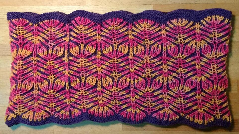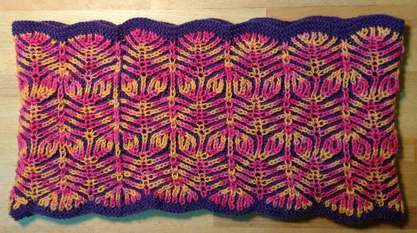 Das Abutilon ist eine Pflanze die Wunden heilt. Mir haben die Farben und die einfache Form der Blüten gefallen. Mit einer handgefärbten Wolle und Zickzackstreifen , die über das Patentmuster verlaufen , habe ich die Streifen der Blüten nachempfunden.