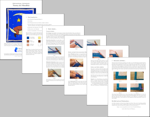 Die Anleitung enthält zusätzlich eine PDF Datei mit der genau abgezählten Maschenanzahl jeder Farbe pro Reihe. Diese Datei kann auf den eBook-Reader oder das Smartphone geladen werden um auch unterwegs bequem häkeln zu können. :)