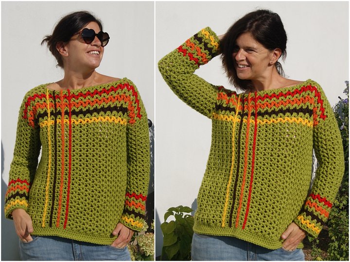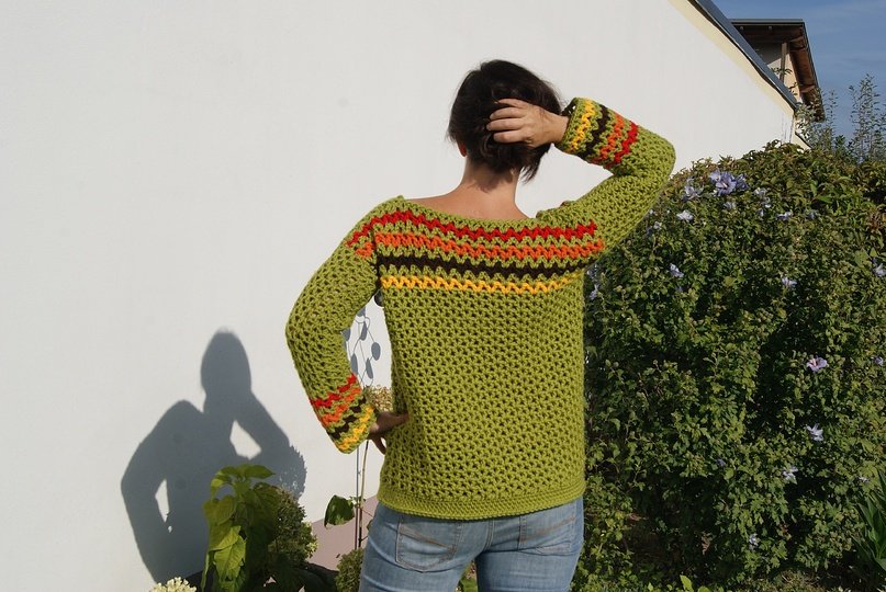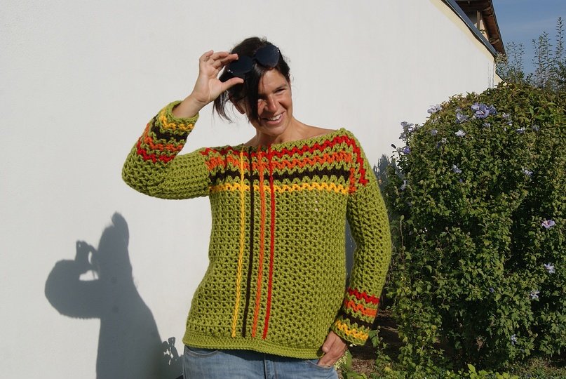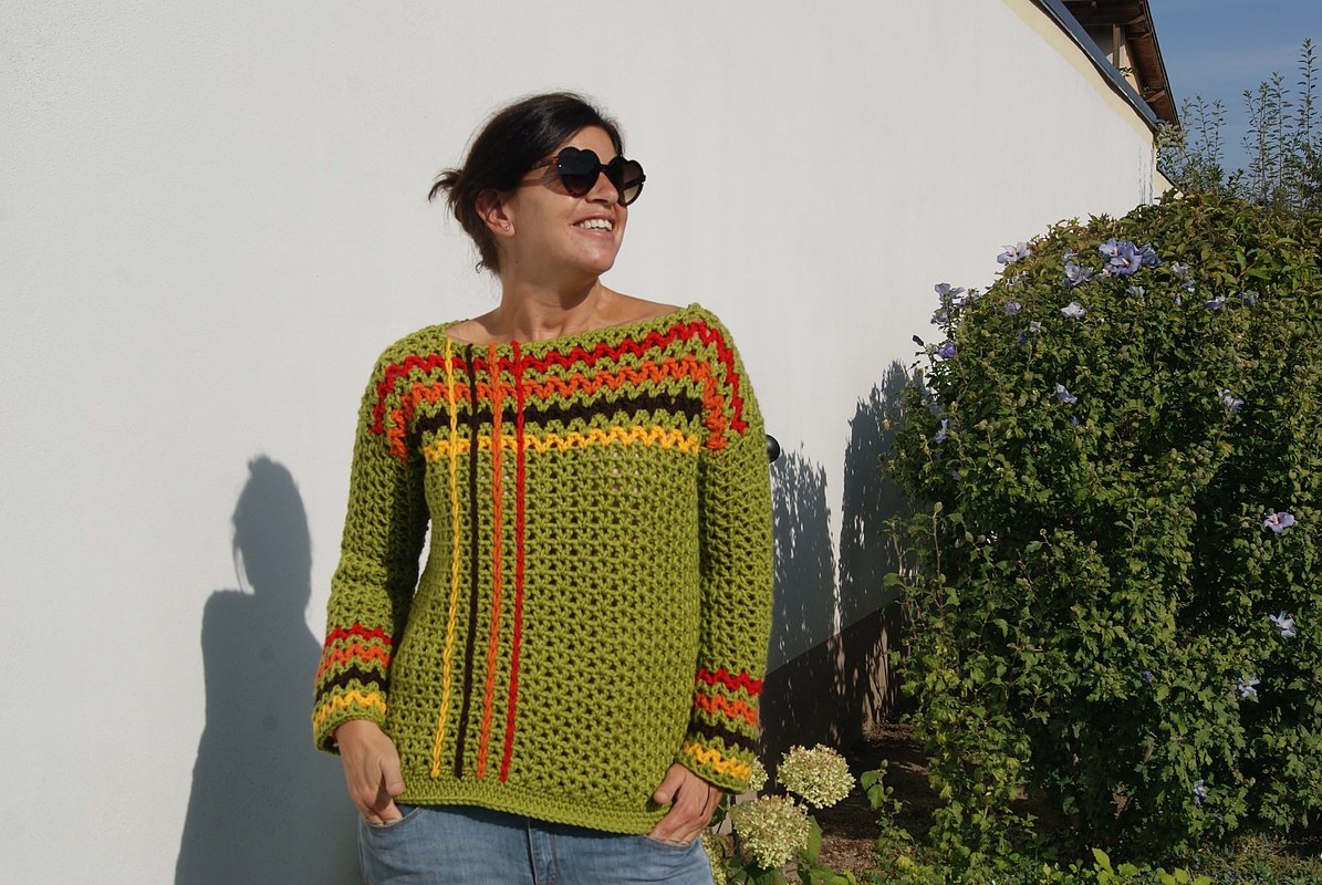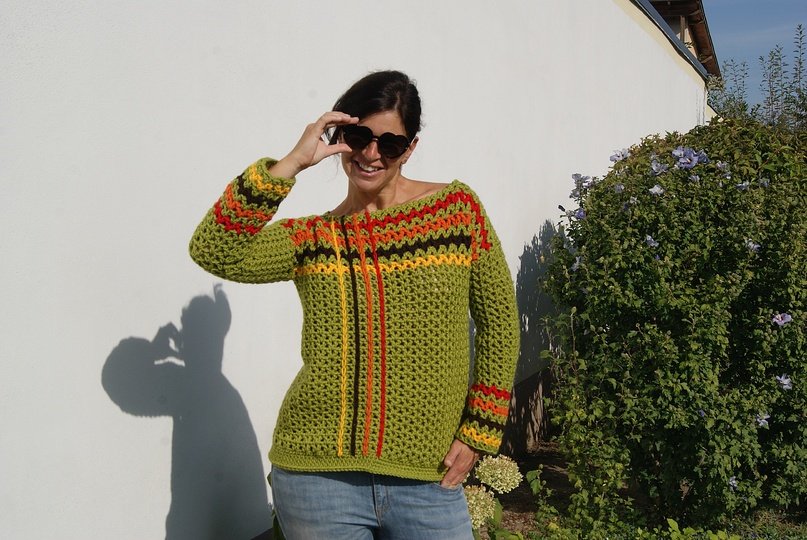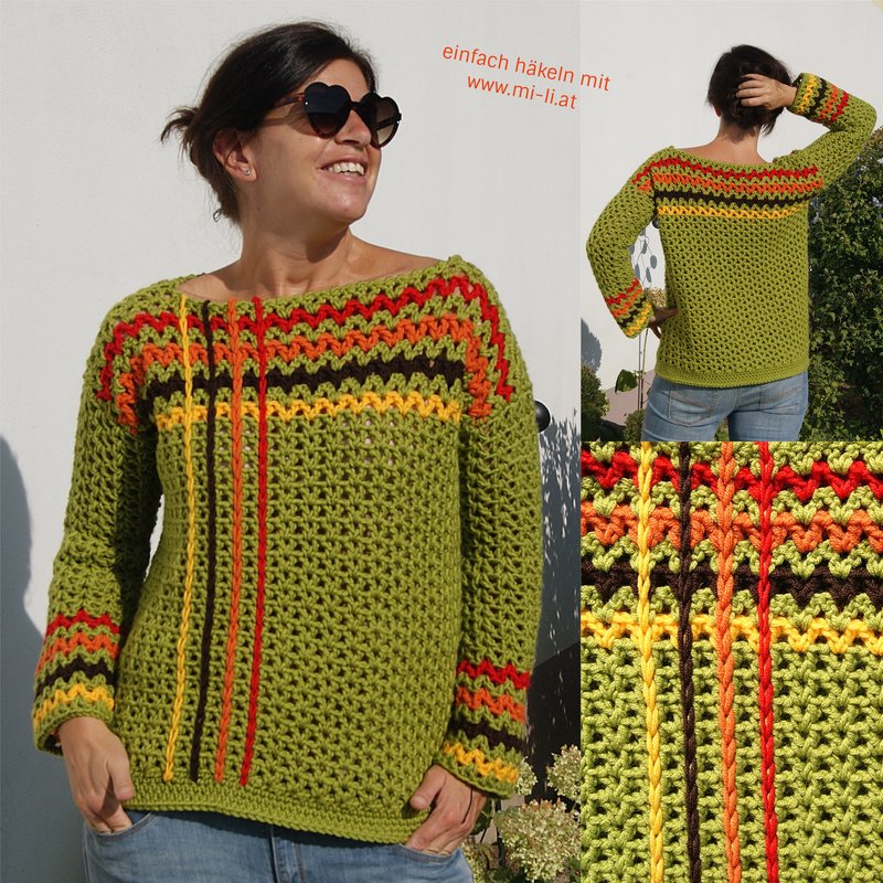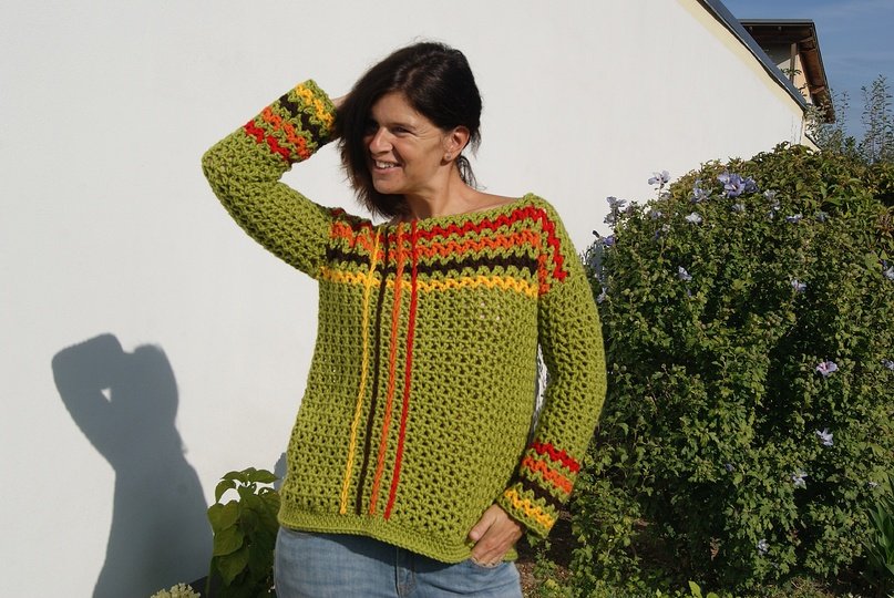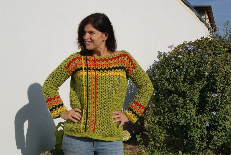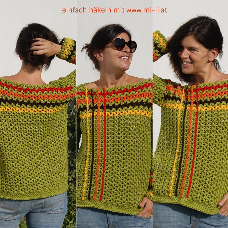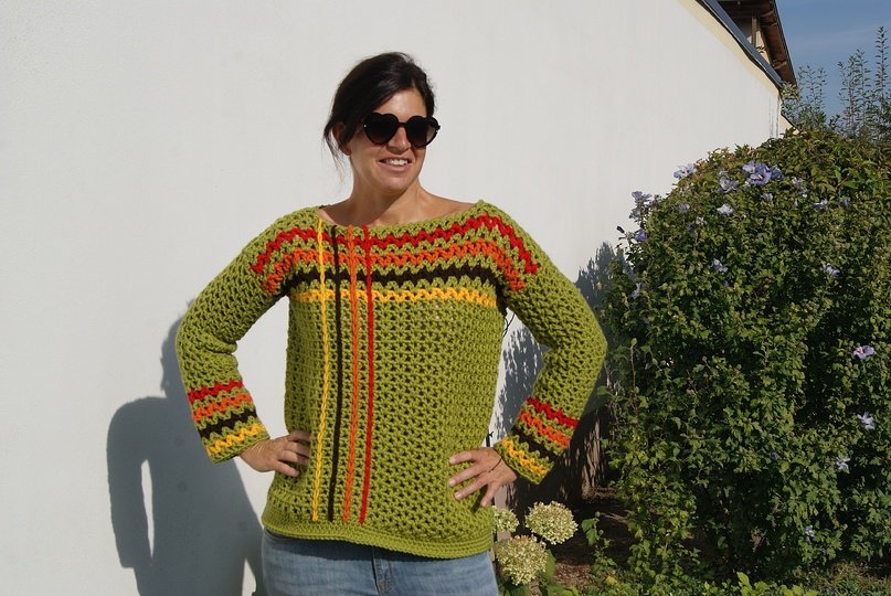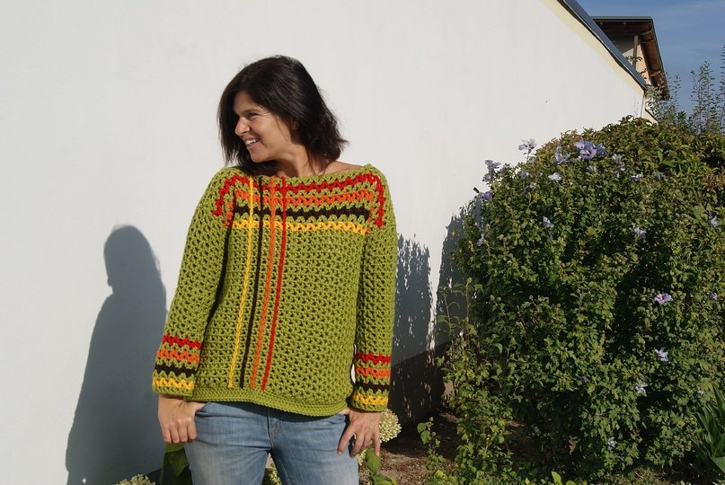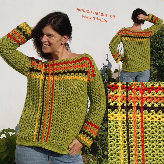 Die Anleitung ist einfach Schritt für Schritt mit vielen Fotos, Skizze, Maßen und Häkelschrift erklärt, die darunter auch genau Runde für Runde bzw. Reihe für Reihe in Worten beschrieben ist. Der Pulli ist ganz leicht für alle Größen anzupassen.