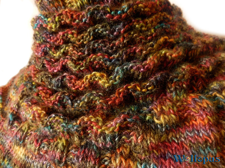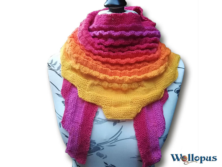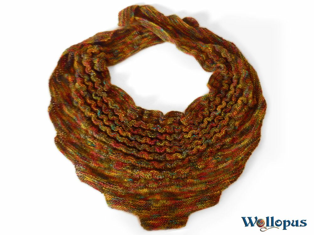Krumme Bea heißt dieses Tuch, weil die Musteridee von dem Tuch Beatrice stammt. Doch dieses Tuch ist symmetrisch und die Anzahl der Maschen und Reihen sind an dieses Tuch angepasst. Durch das Muster zieht sich das Mittelteil so zusammen, das es diese leicht gebogene Form ergibt. Diese legt sich sehr anschmiegsam um Hals und Schultern wie auf den Bildern zu erkennen ist. Denn es hat eine eingebaute Knautschzone.