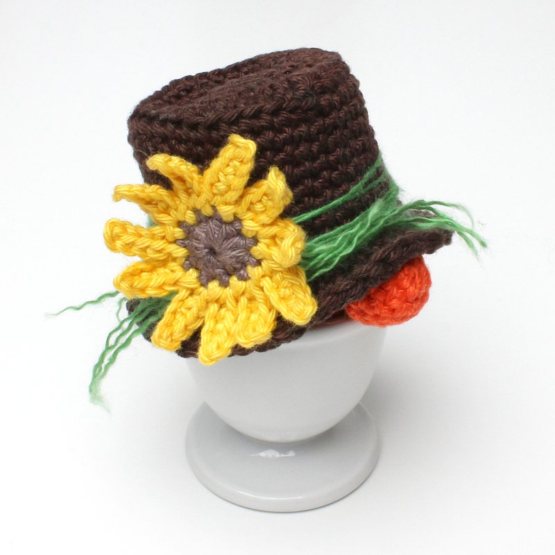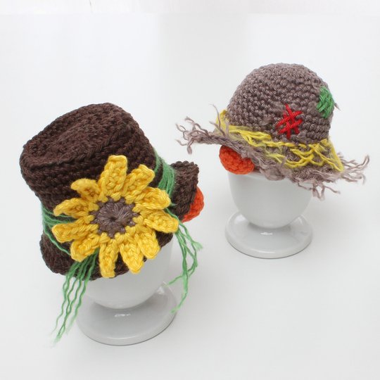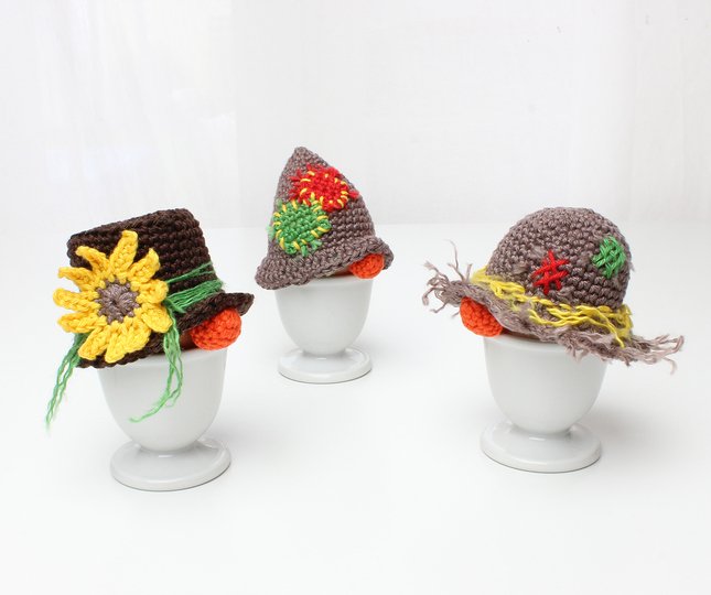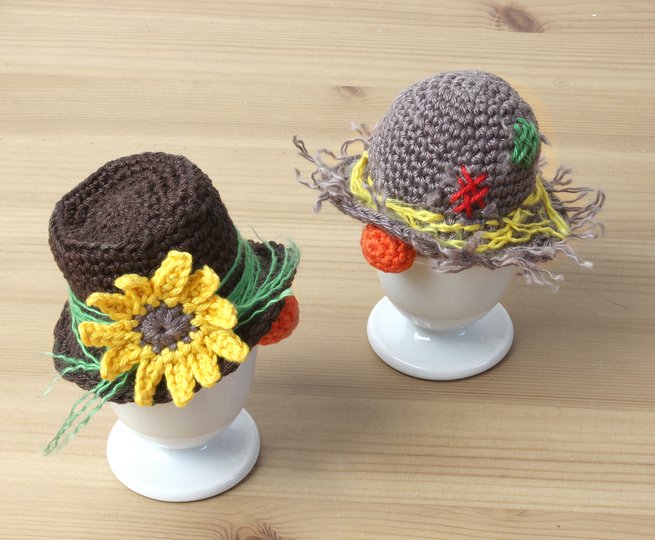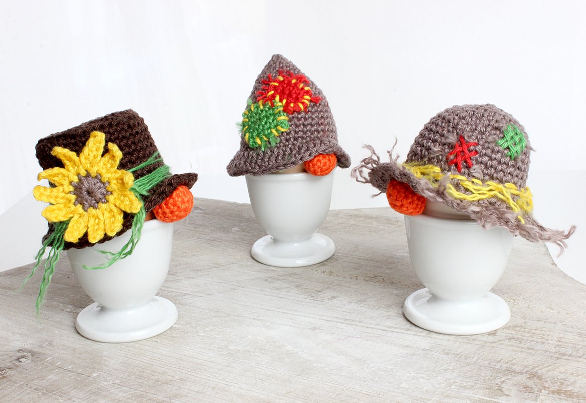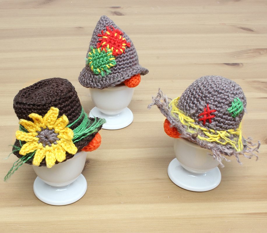 Häkelanleitung: Eierwärmer „Vogelscheuchen-Trio“ – herbstliche Deko mit Hut & Charme