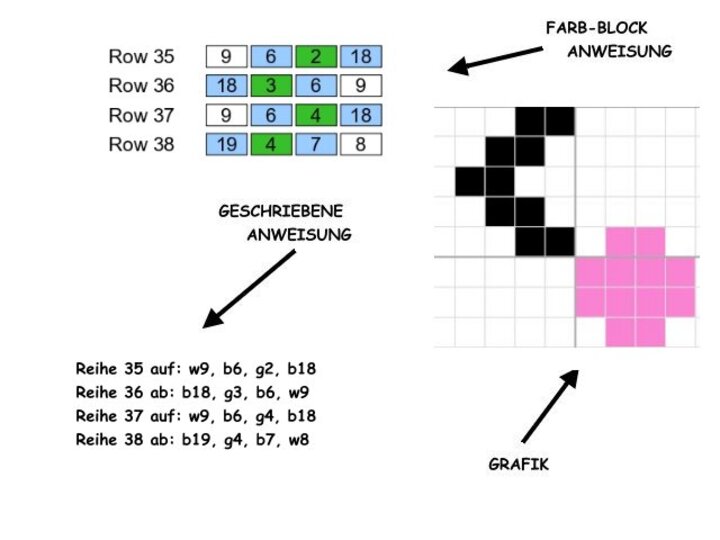 -farbige Zahlen-Blöcke für jede Zeile für C2C-Technik