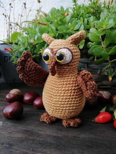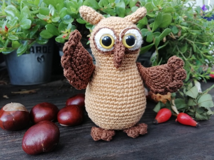 Die Eule ist mit der angegebenen Wolle ca. 10cm groß.