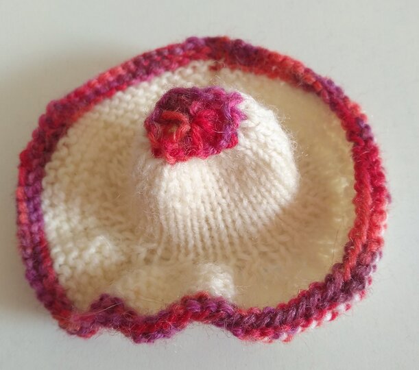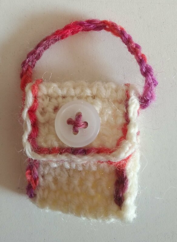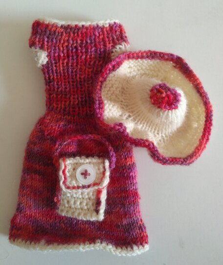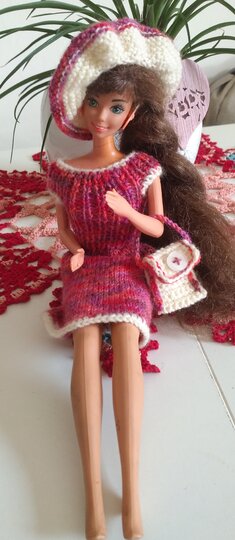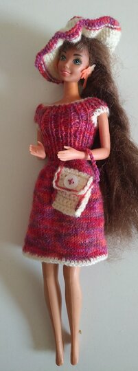 Das Kleid und der Hut wird gestrickt und die Tasche gehäkelt.