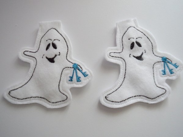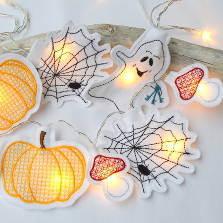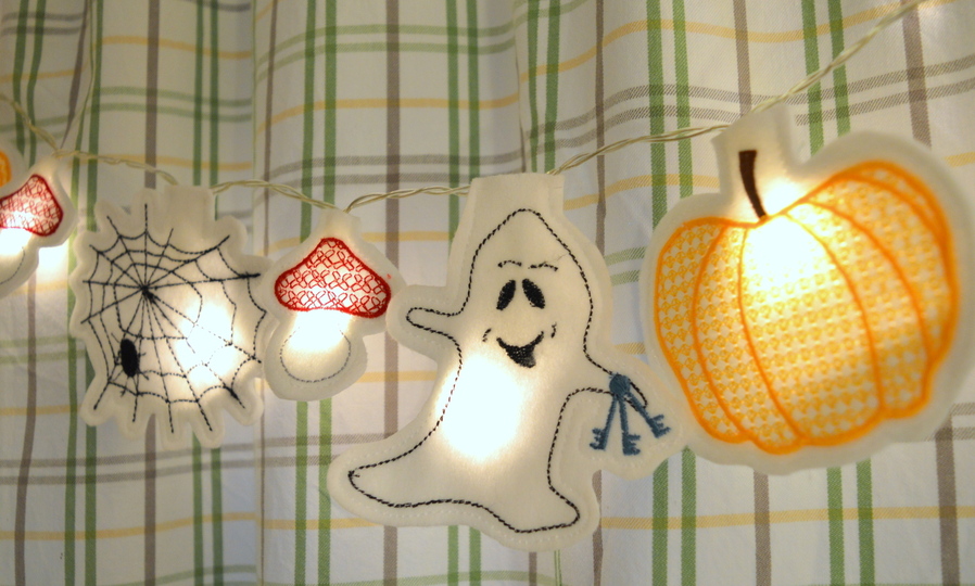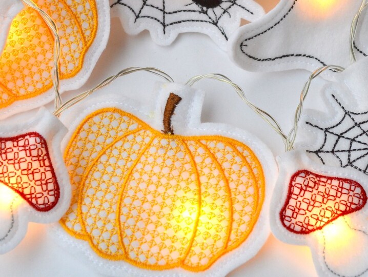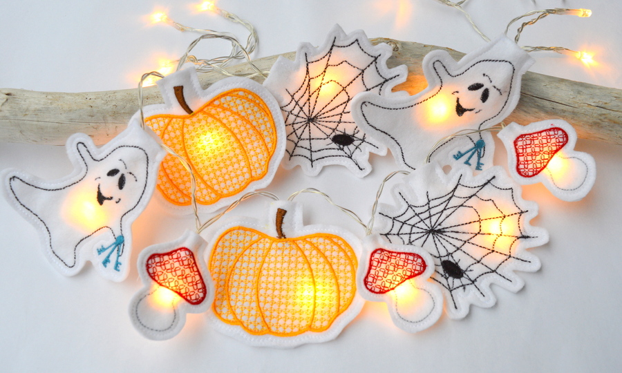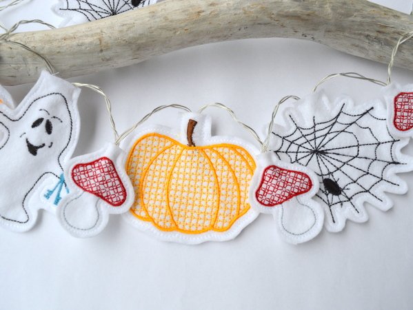 Nach dem Sticken werden die einzelnen Motive über eine kleine Öffnung über die einzelnen kleine LED Lichter einer Lichterkette gegeben. Süße Dekoration zu Halloween. Es können gemischte Girlanden gestickt werden oder aber auch ein Motiv für alle LED Lämpchen. Die Menge variiert, je nachdem wie viele LEDs eure Lichterkette hat.