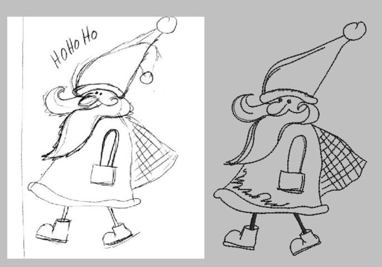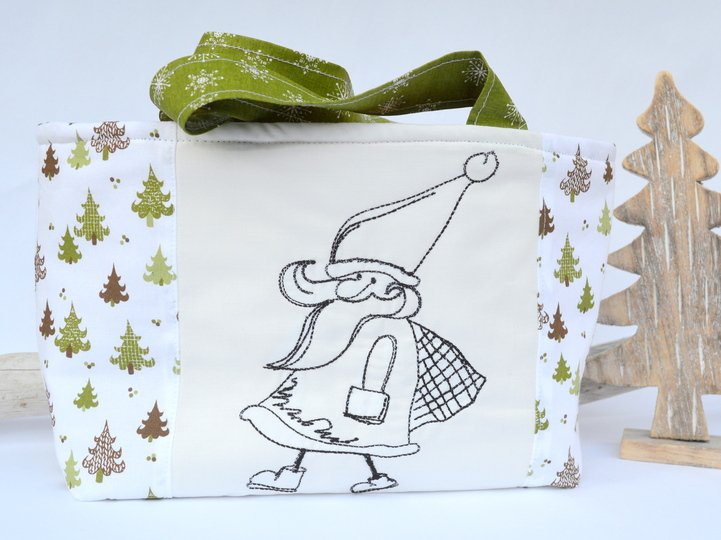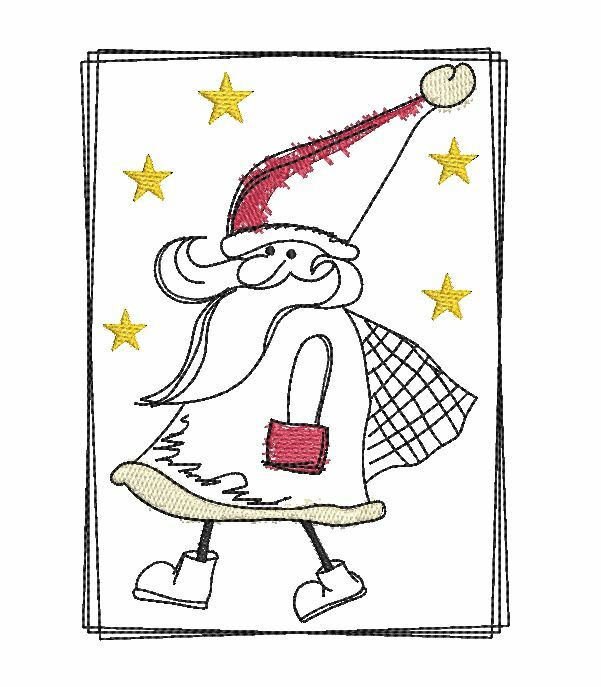 Zusätzlich ist der Nikolaus in einem doodle Rahmen enthalten. Hier wird der Rahmen im ersten Stickgang vorgestickt, dann wird Stoff aufgelegt und mit drei versetzten Rahmen festgestickt, bevor der Nikolaus entweder einfarbig oder teilweise mit bunten Stickereien hiterlegt gestickt wird.