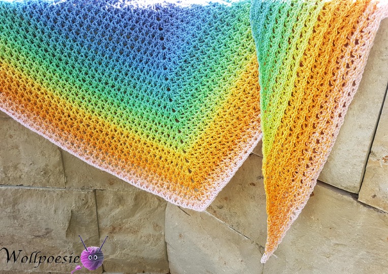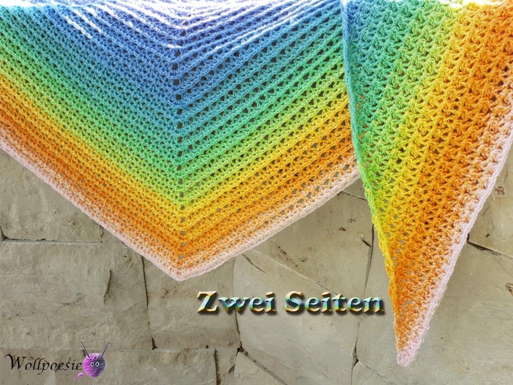 Das Zwei Seiten Tuch wurde aus einem Scheepjes Whirl 215-225g = 1000m mit einer Häkelnadel der Stärke 4,5 und 4 gehäkelt.