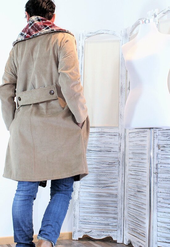 Den Mantel gibt es in zwei Längen, mit Nahttaschen, einen breitem und schmalem Schalkragen, Gürtel und Gürtelschlaufen in den Größen XS-XXL.