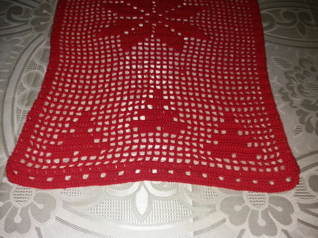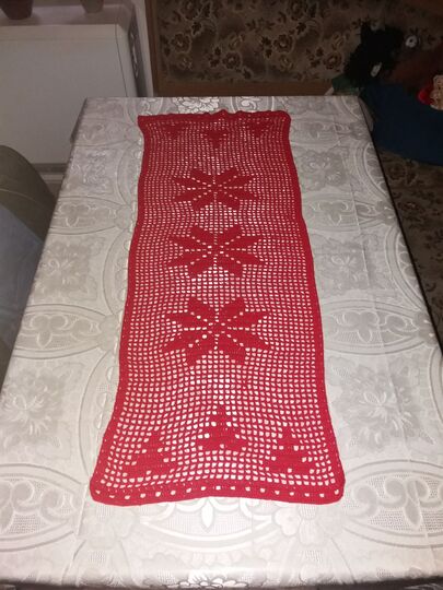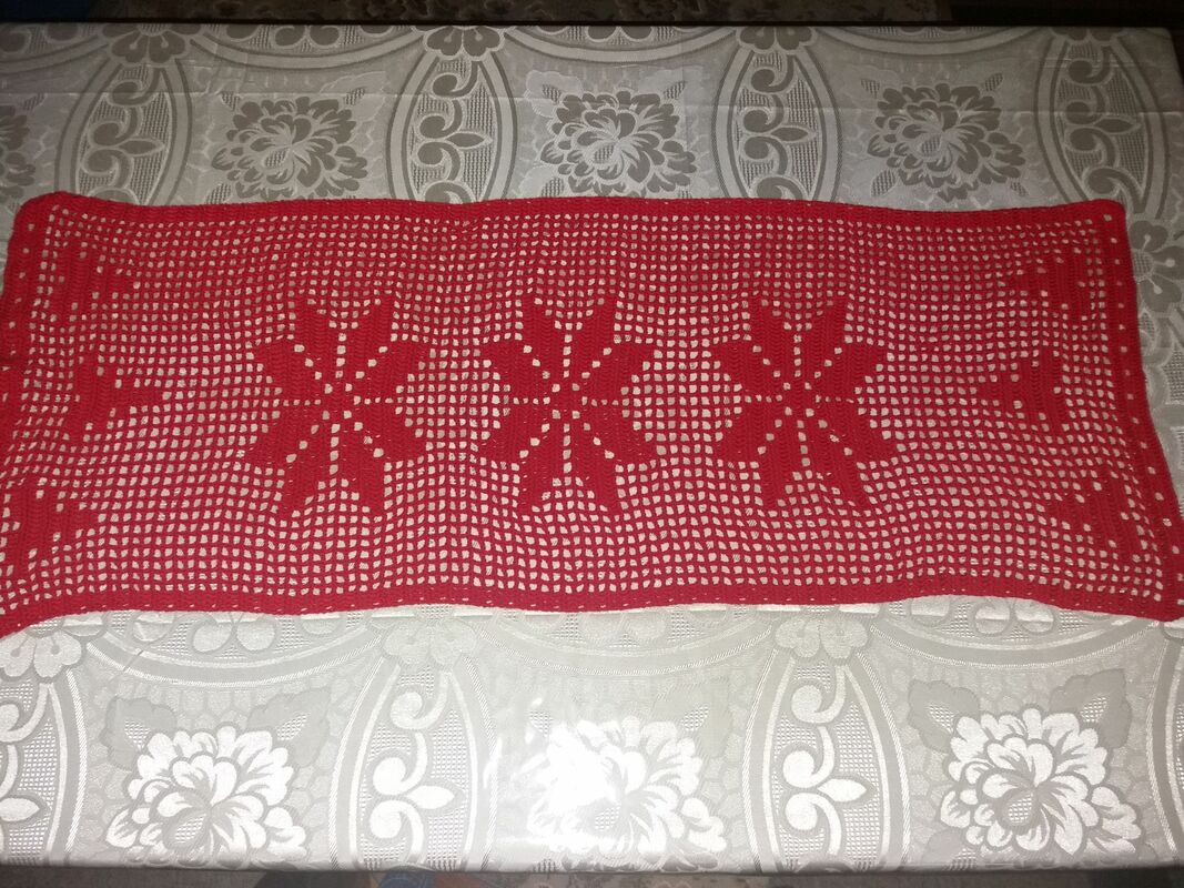 Der Tischläufer hat das Maß von ca.LxB 93 cm x 36 cm, dafür habe ich 2,5 Knäul a` 180m / 50g benötigt.