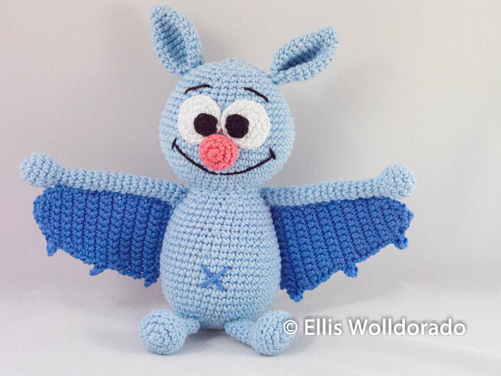 Mit einem Baumwollgarn (Lauflänge 125 m / 50 g) wie z. B. Catania von Schachenmayr, Cotton Quick von Gründl, Miami von RedHeart, Cotone von Lana Grossa oder Carina Baumwolle und einer Häkelnadel Nr. 3 wird eine Fledermaus ca. 19 cm groß.
