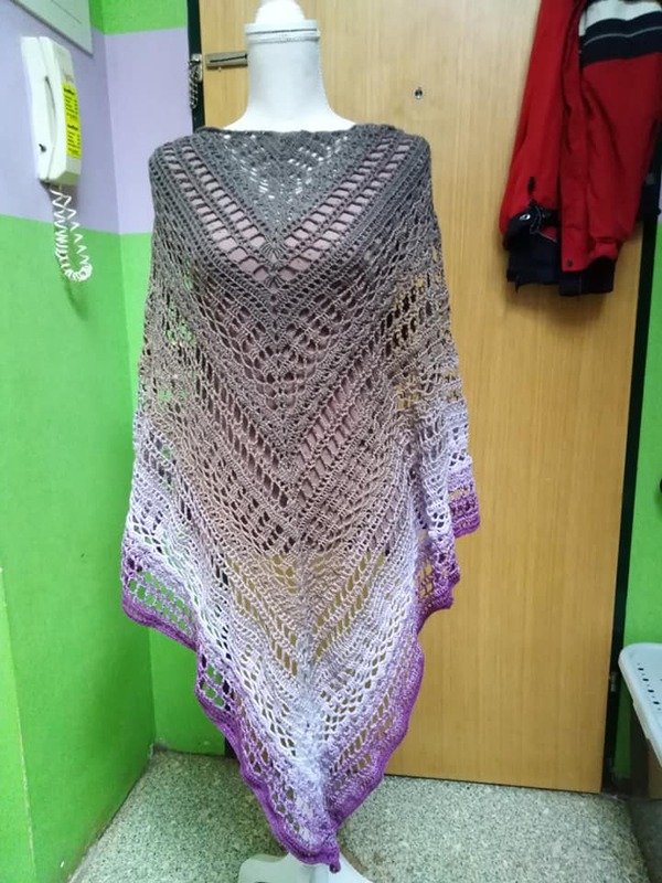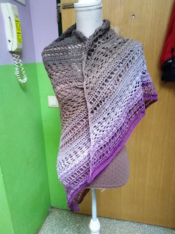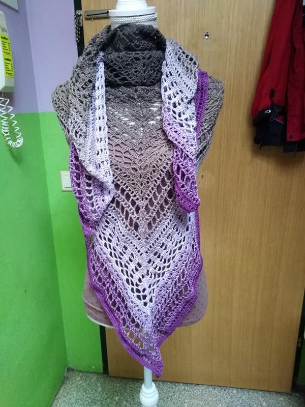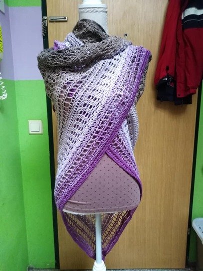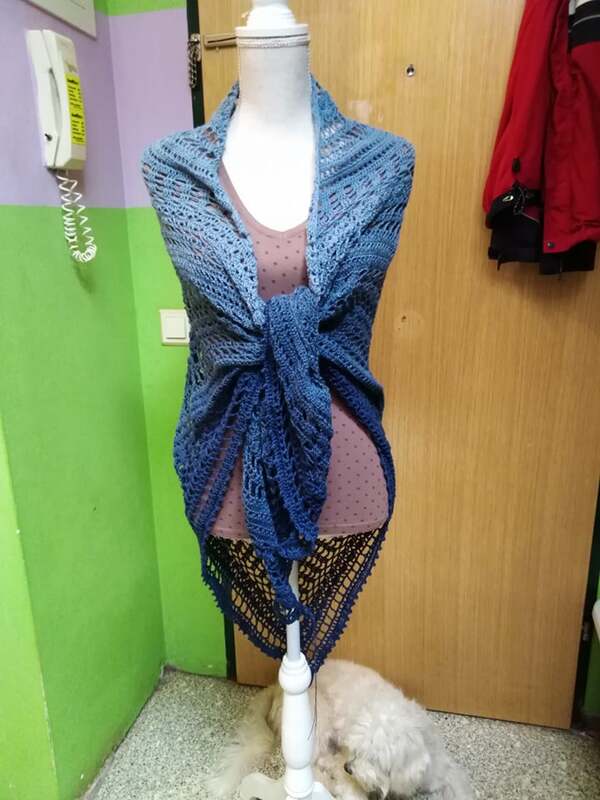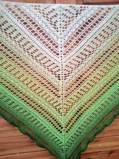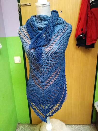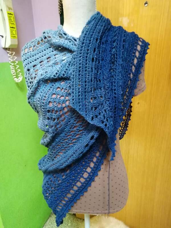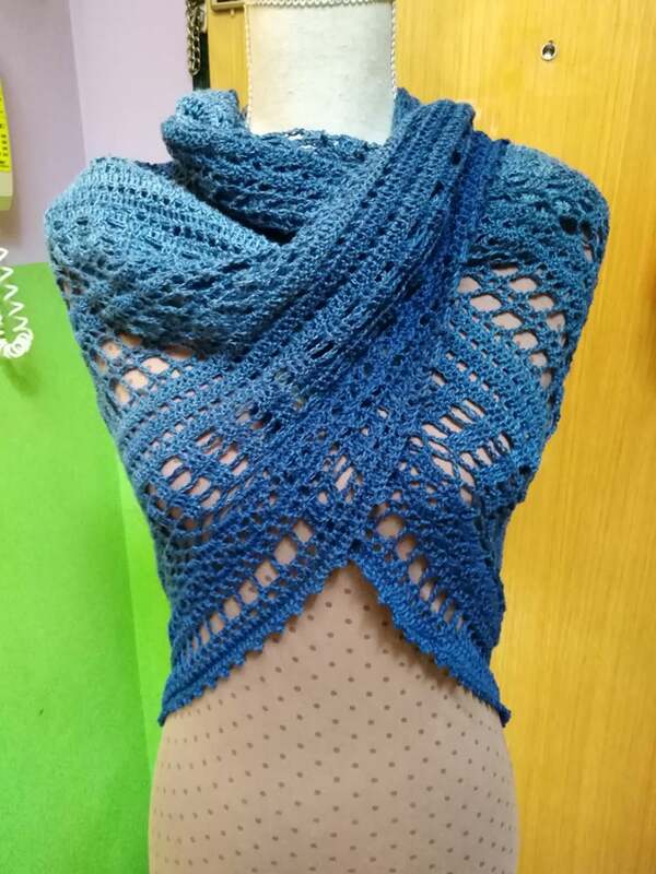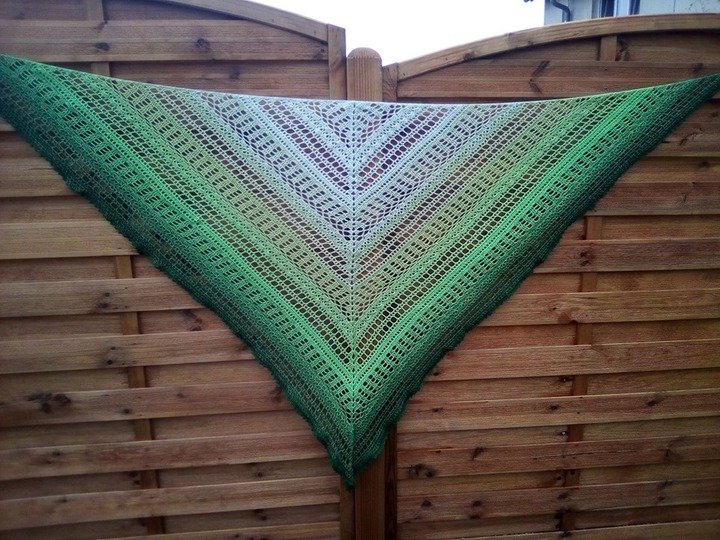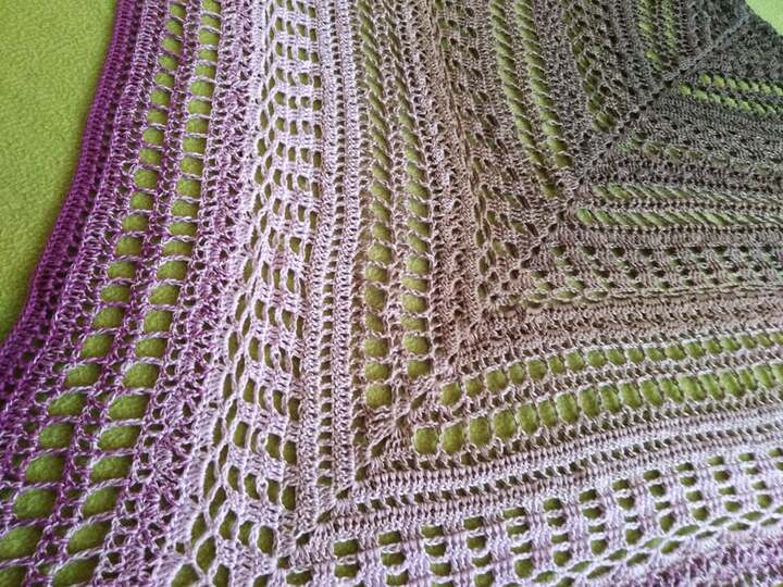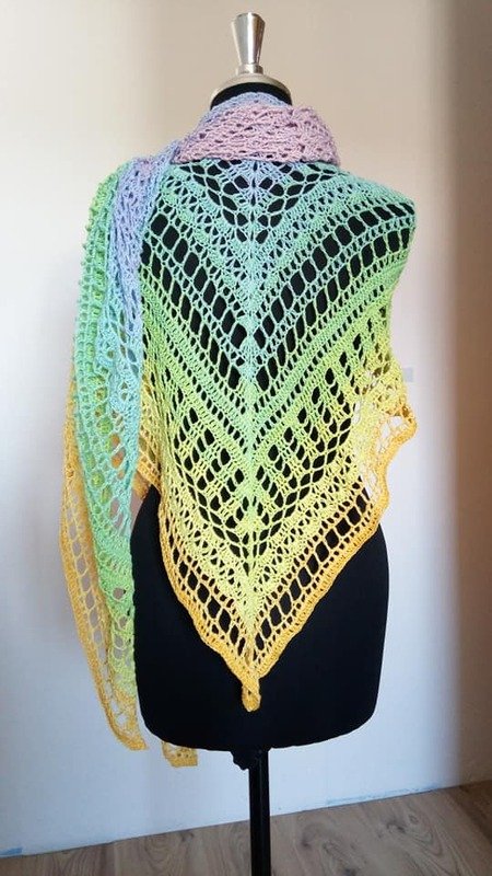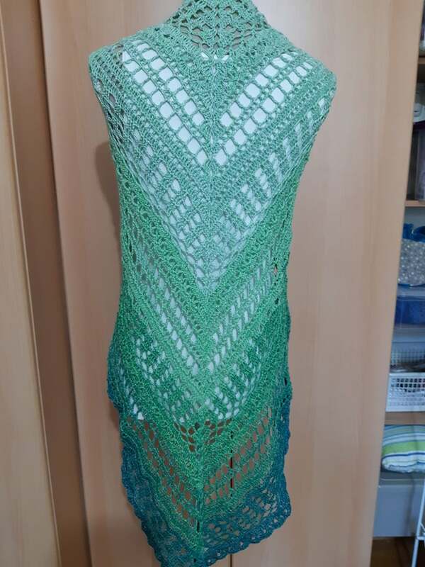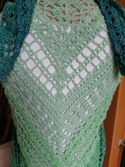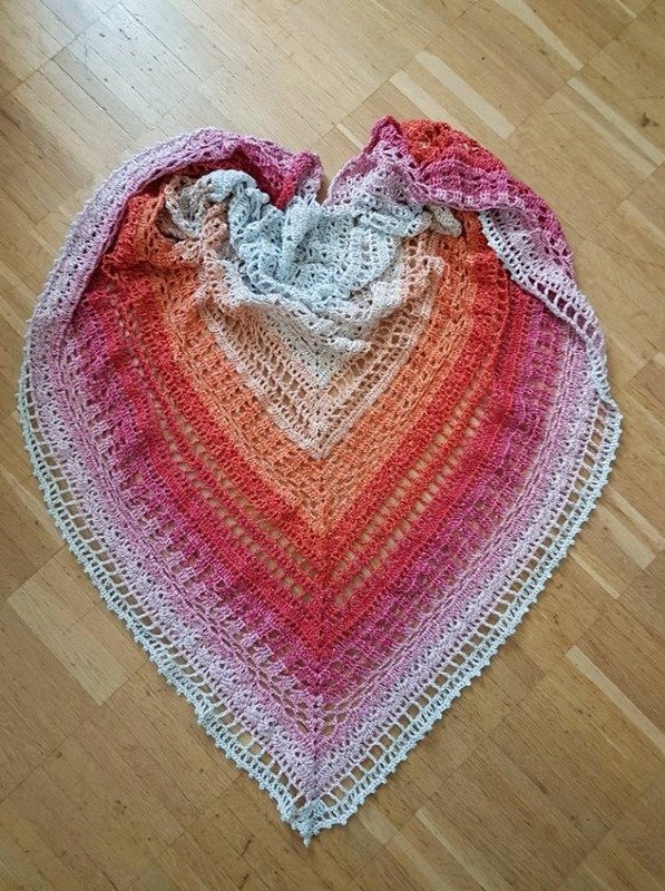Das Tuch Lisa ist ein sehr großes Dreiecktuch bei dem die Farben des Bobbels toll zur Geltung kommen.Es wurde mehrfach Probegehäkelt. Anfangs muss man ein wenig mitzählen, danach läuft es fliessend von der Hand und ist trotz der Größe recht kurzweilig zu arbeiten.