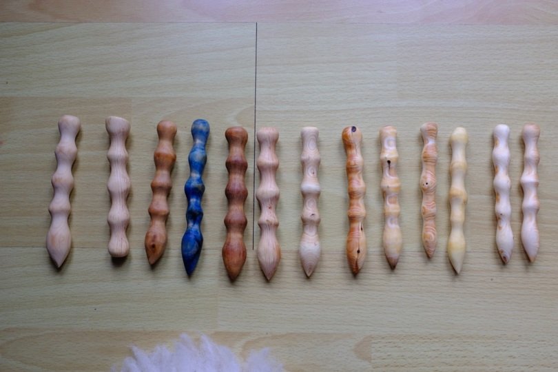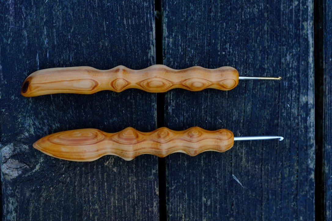 Die Häkelnadelgriffe aus Holz sollten 12-15 cm lang sein. Die Dicke entscheidest Du selber nach Belieben.