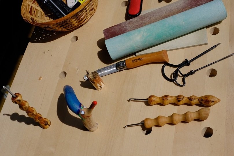 Werkzeuge: Säge, Halbrundfeile, Sandpapiere, Handbohrer, Taschenmesser
