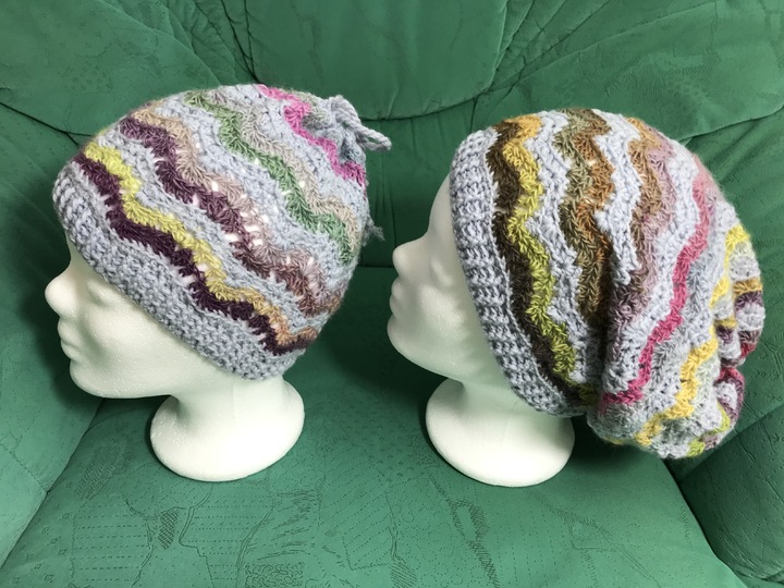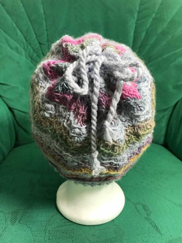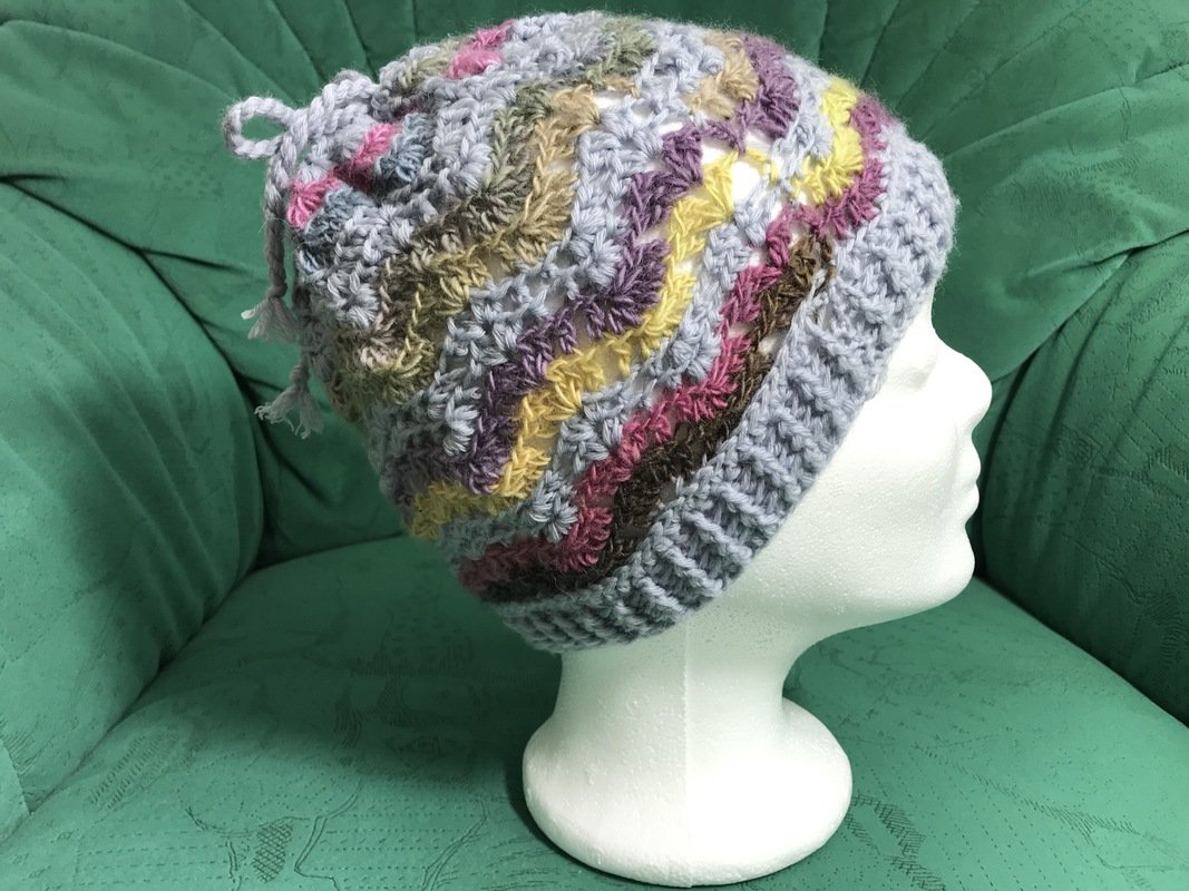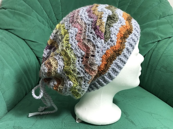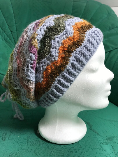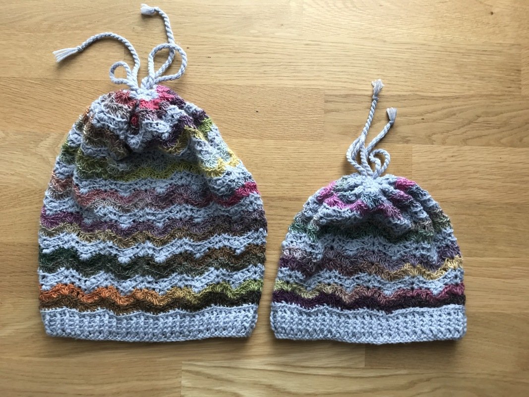 Das Zickzack-Muster ist einfach und schnell gehäkelt und die Mütze kommt ganz ohne Maschenzunahmen und – abnahmen aus, da sie am Ende nur mit einer Kordel dekorativ zusammengezogen wird