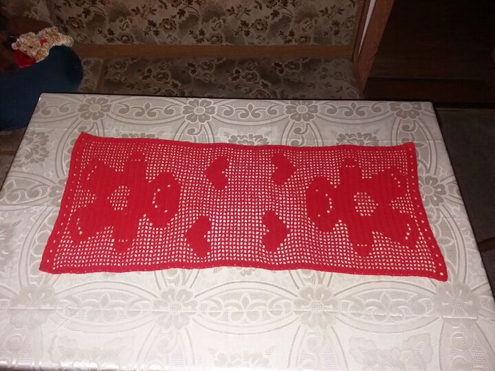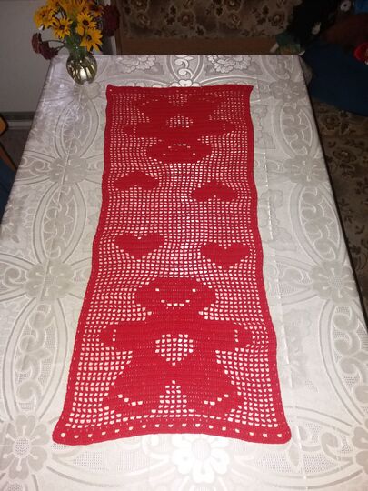 Der Tischläufer hat das Maß von ca.LxB 84 cm x 38 cm, dafür habe ich 2,5 Knäul a` 180m / 50g benötigt.