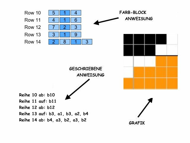 -farbige Zahlen-Blöcke für jede Zeile für C2C-Technik