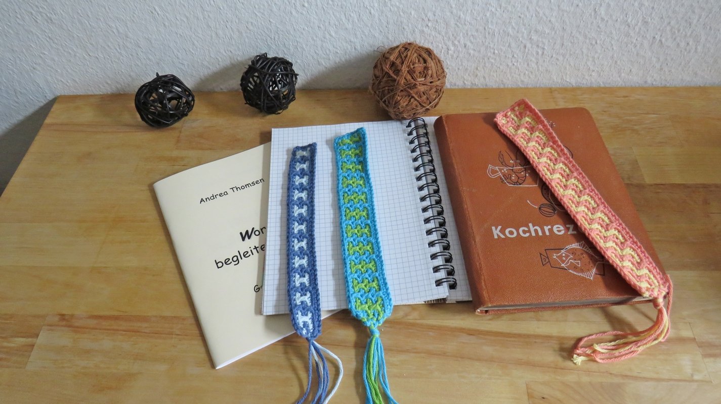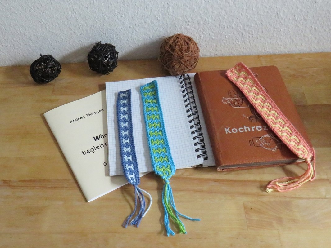 Lesezeichen kann man nie genug haben. Sie sind vor allem immer auch ein schönes Geschenk, mit oder ohne Buch dazu.Ich habe gleich 3 verschiedene Ausführungen des gleichen Musters in eine Anleitung gepackt.