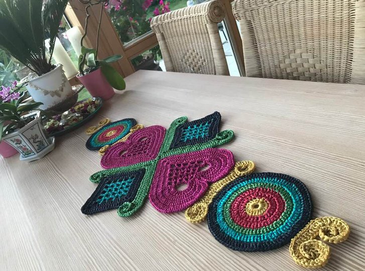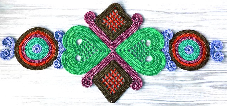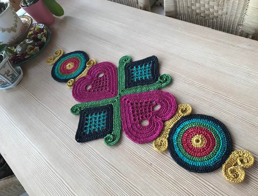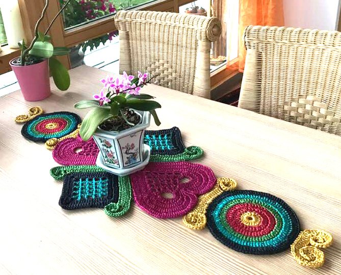 Tischläufer WALLY bring Farbe Dir und Schwung in die Bude...! Dieser farbenfrohe Tischschmuck ist eine schöne Handarbeit und hilft mir über trübe Wintertage hinweg. Tischläufer WALLY ist auch als Wandschmuck geeignet! Einfach an die Wand oder auf eine Platte nageln....!