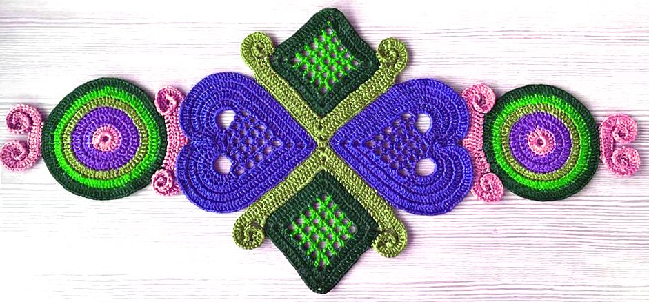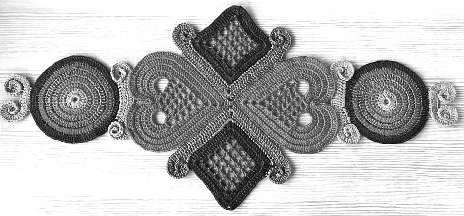 Tischläufer WALLY wiegt fertig bei mir 450 gr..dieses Bändchengarn, das ich nehme, ist eher schwer.. WALLY ist 100 cm lang und in der Mitte 50 cm breit.