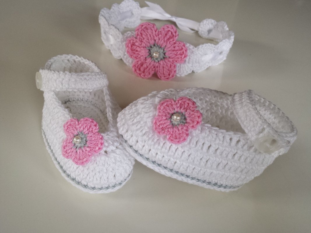 Dies ist eine Häkel-Anleitung für die auf dem Foto abgebildeten Schühchen sowie das Haarband nicht das fertige Produkt!!