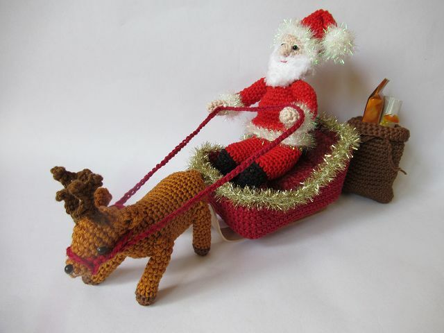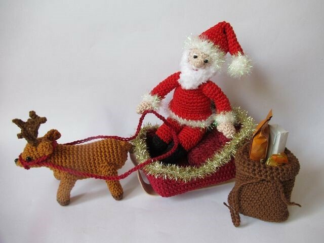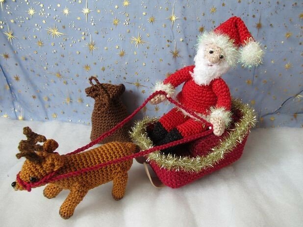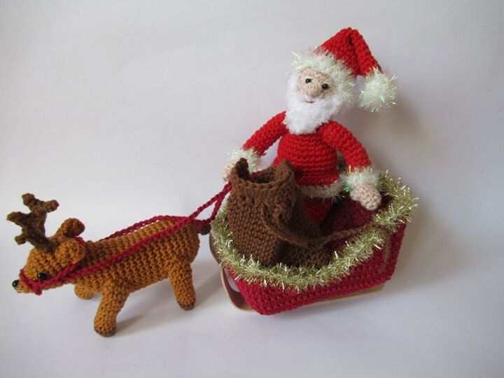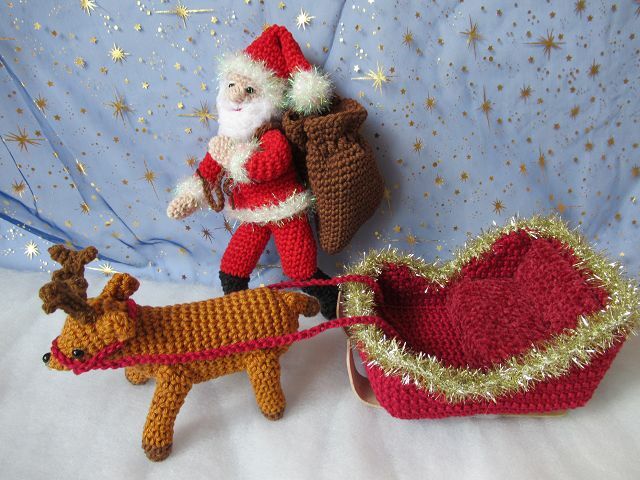 Hier erhältst du die Häkelanleitung für den Weihnachtsmann, das Rentier, den Schlitten und den Sack. Die Teile sind nicht fest miteinander verbunden, so dass du sie auch einzeln dekorieren kannst.