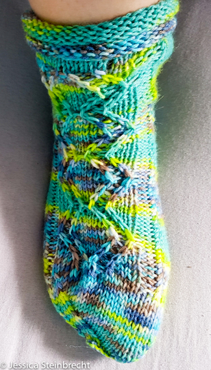 Das Bündchen, die Ferse und Bandspitze muss dann allerdings individuell angepasst werden, das wird nicht weiter beschrieben.