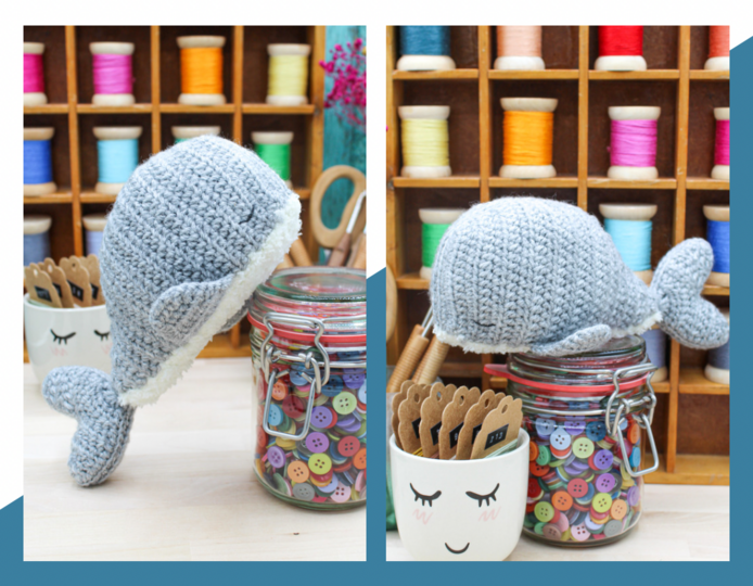 Zauberschön illustrierte Anleitung für einen gehäkelten Walfisch.