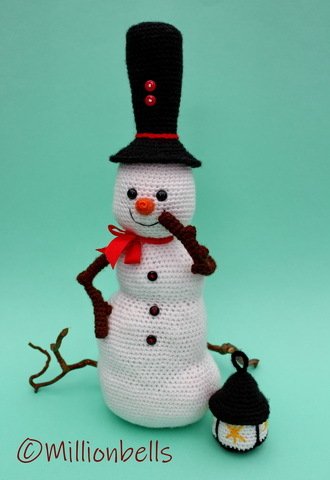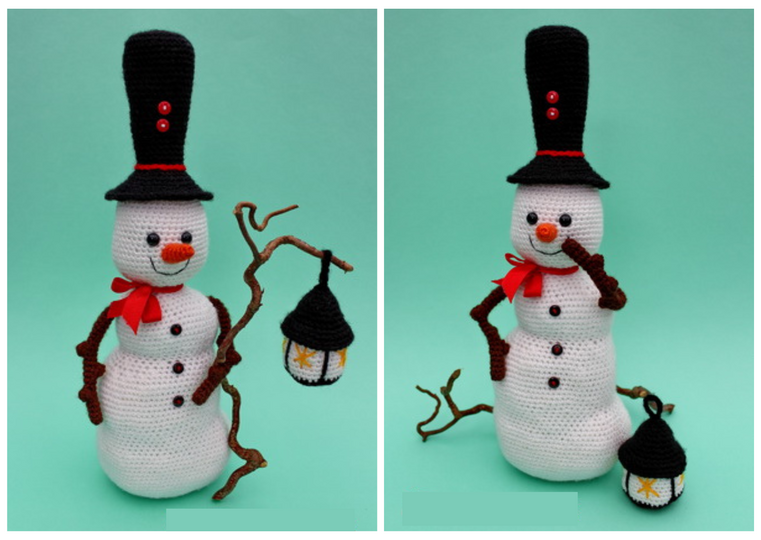 Schneemann im Bilder ist ungefähr 34 cm hoch, hergestellt aus Polyacrylgarn (DK stärke 3) und Häkelnadel 3,5 mm.
