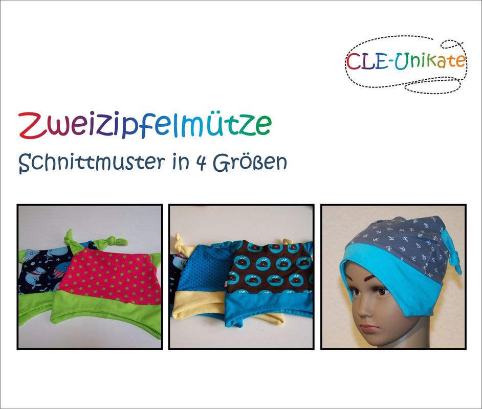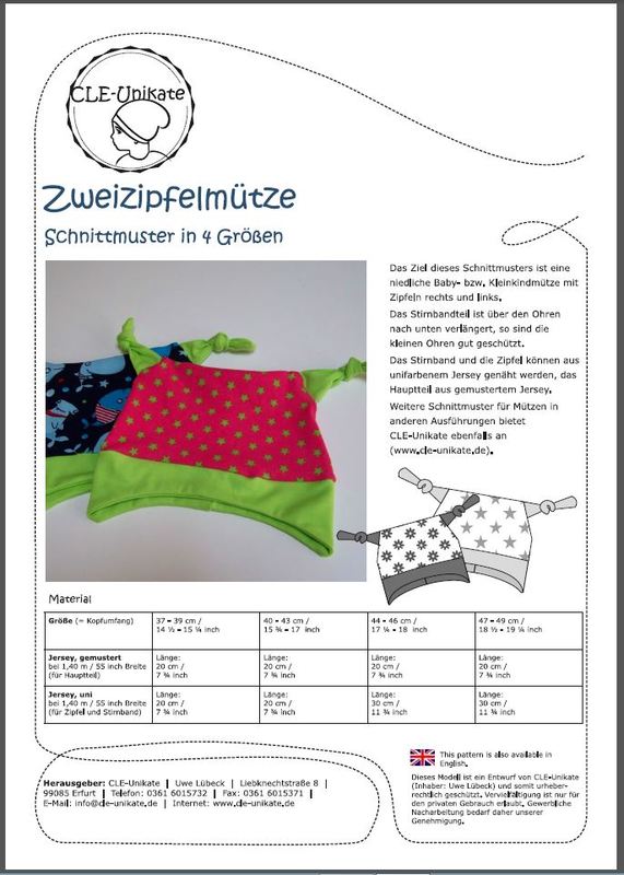 Das Ziel dieses Schnittmusters ist eine niedliche Baby- bzw. Kleinkindmütze mit Zipfeln rechts und links. Das Stirnbandteil ist über den Ohren nach unten verlängert, so sind die kleinen Ohren gut geschützt. Das Stirnband und die Zipfel können aus unifarbenem Jersey genäht werden, das Hauptteil aus gemustertem Jersey.