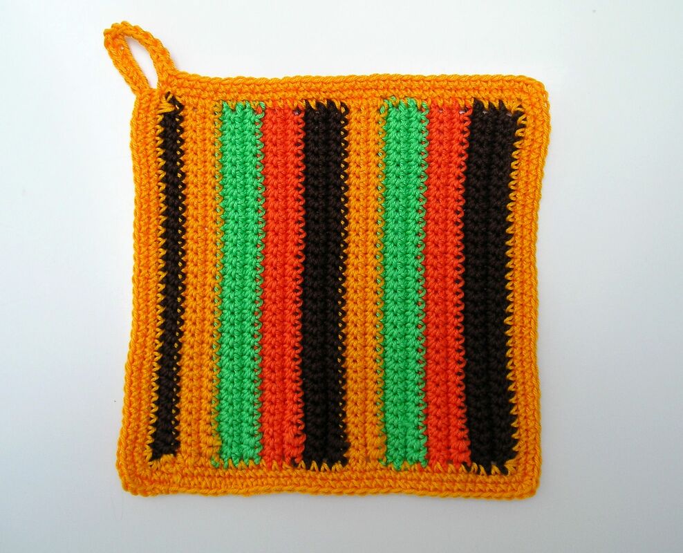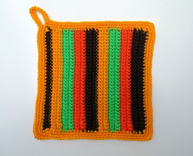 Der Motivtopflappen wird mehrfädig mit festen Maschen gehäkelt. Dabei hat man einen Arbeitsfaden und mehrere Ruhefäden. Während man mit dem Arbeitsfaden Maschen häkelt werden die Ruhefäden von den festen Maschen mit umhäkelt. Dadurch bilden die Ruhefäden auf den Rückseite keine langen Schlaufen und sind fast unsichtbar. Das ist nicht besonders schwierig und auch für Häkelanfängerinnen gut zu bewältigen. Die Anleitung enthält eine ausführliche textliche Beschreibung sowie eine Häkelschrift.