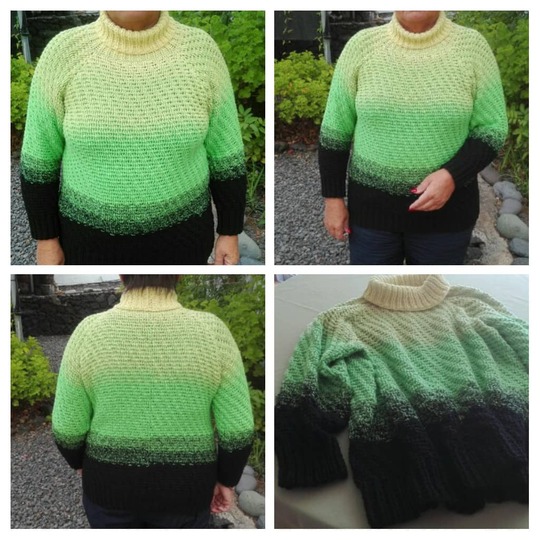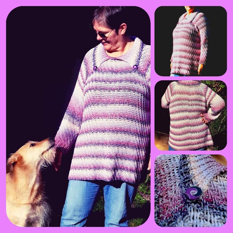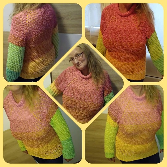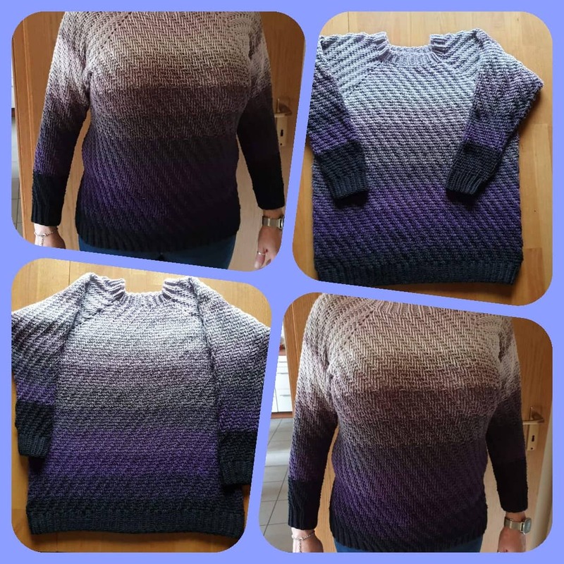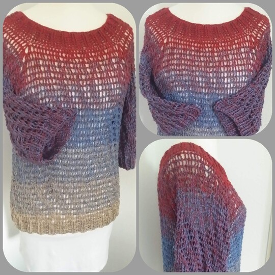 Gr: 44/46, Garnverbrauch Korpus & Kragen ca. 3000m LL, Garnverbrauch Ärmel: 2x ca. 500m LL, 3+1fädig Farbentanz Nr 8, NS 3,5