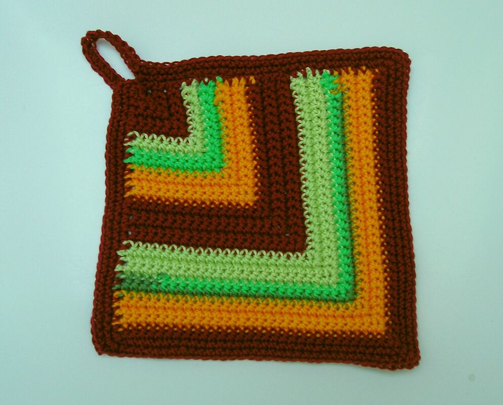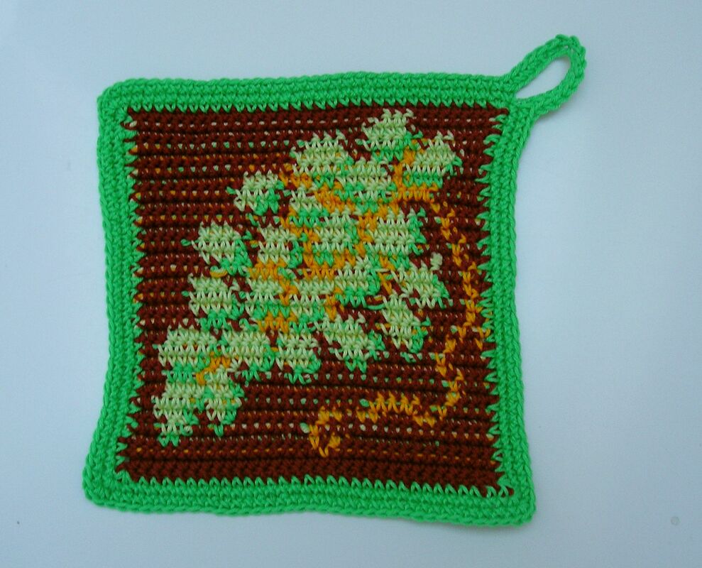 Der Motivtopflappen wird mehrfädig mit festen Maschen gehäkelt. Dabei hat man einen Arbeitsfaden und mehrere Ruhefäden. Während man mit dem Arbeitsfaden Maschen häkelt werden die Ruhefäden von den festen Maschen mit umhäkelt. Dadurch bilden die Ruhefäden auf den Rückseite keine langen Schlaufen und sind fast unsichtbar. Das ist nicht besonders schwierig und auch für Häkelanfängerinnen gut zu bewältigen. Die Anleitung enthält eine ausführliche textliche Beschreibung sowie eine Häkelschrift.