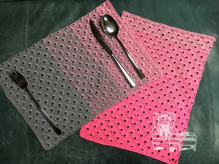 Die Tischsets sind in ungespanntem Zustand 37x25 cm gross. Wer diese Sets gerne etwas grösser haben möchte, kann diese in feuchtem Zustand spannen und trocknen lassen. Oder für deren Herstellung z.B. 4-faches Garn verwenden, oder eine dickere Häkelnadel verwenden. Beachte jedoch, dass sich der Materialverbrauch daher verändern kann.