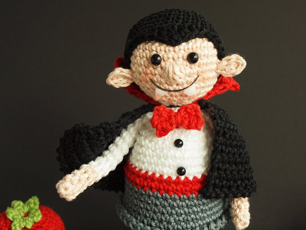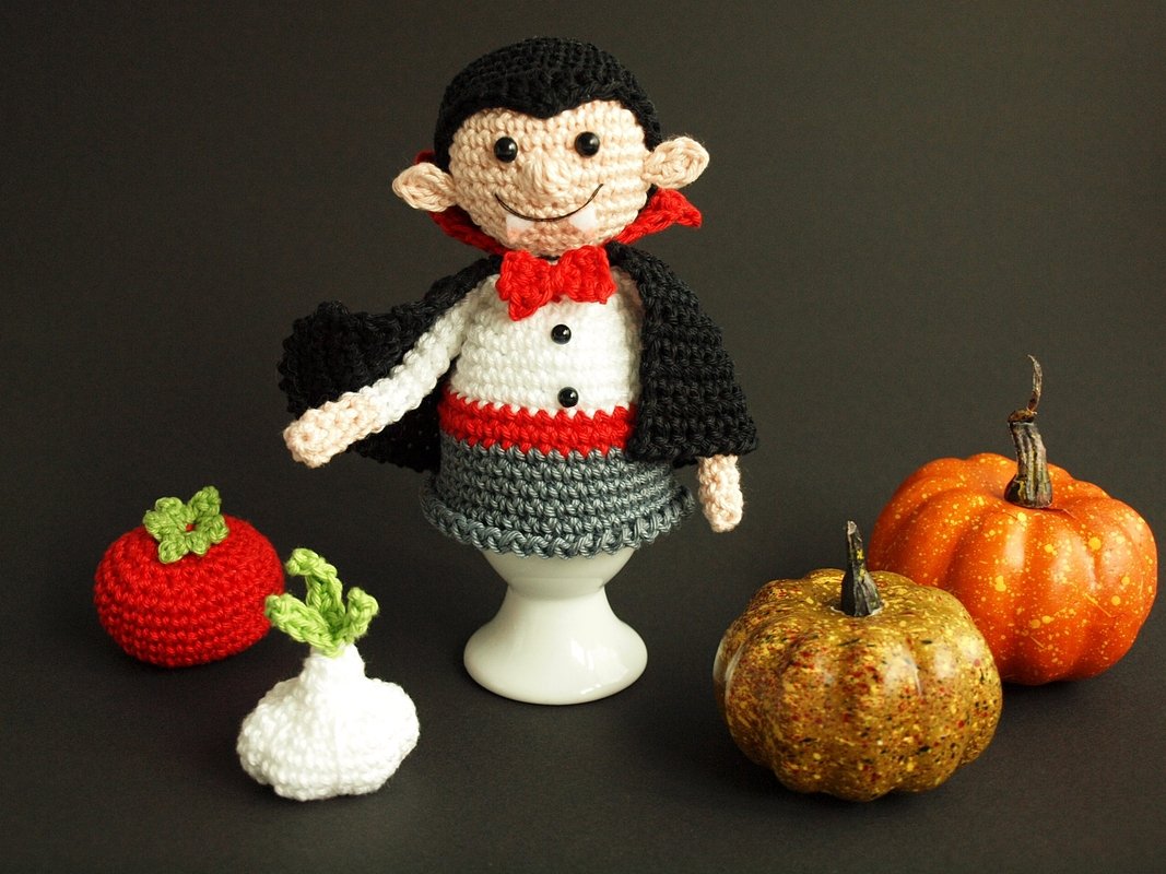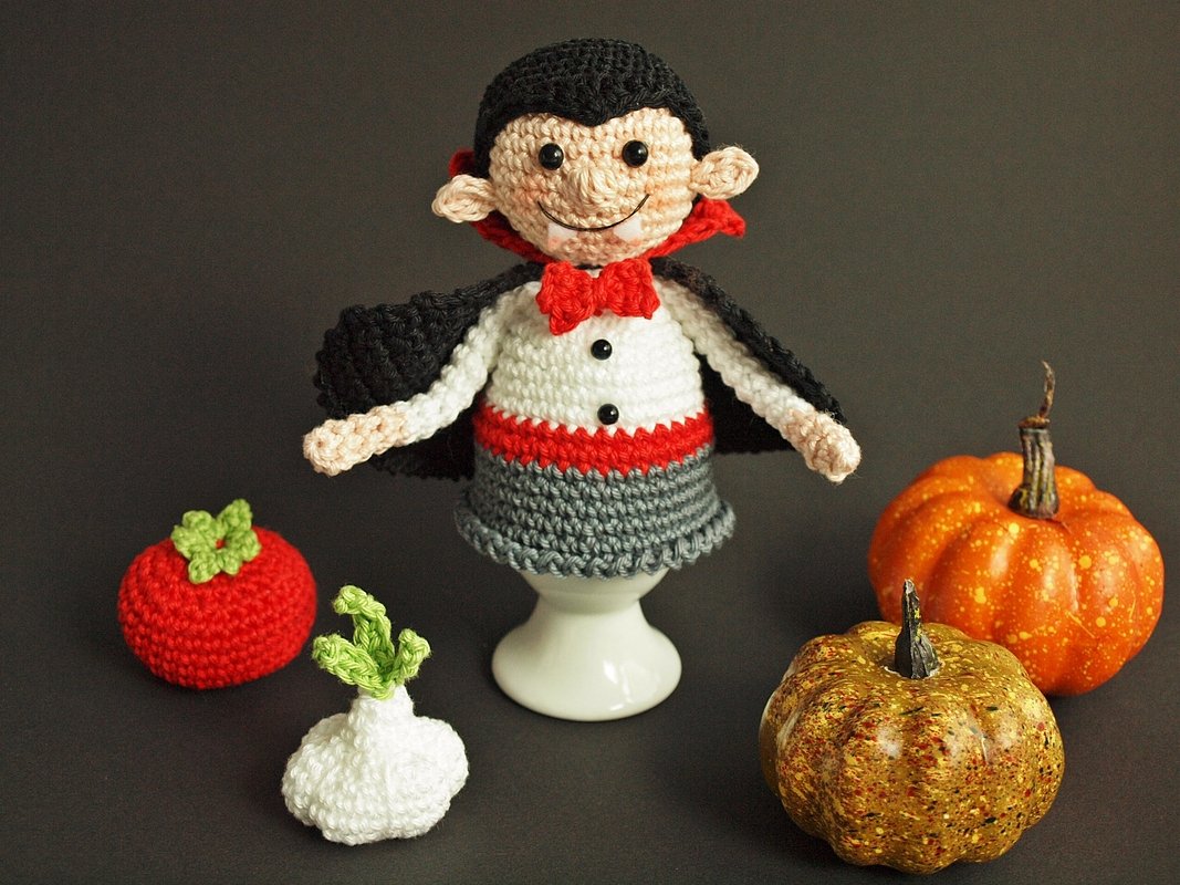 Häkelanleitung für einen Eierwärmer-Vampir inkl. Tomate und Knoblauch