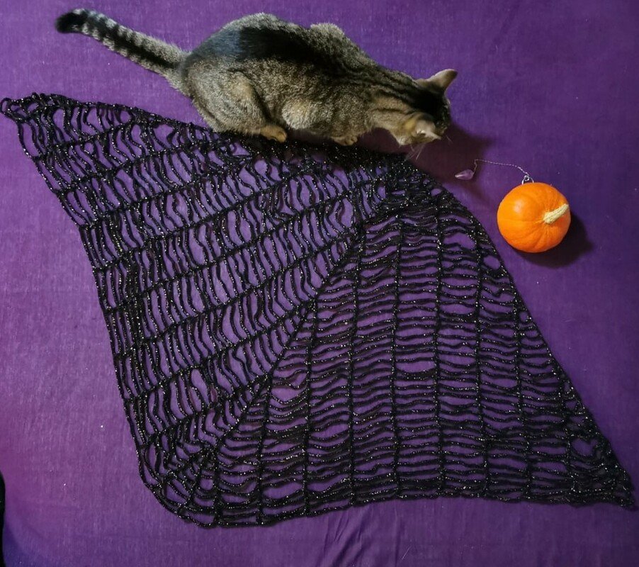 Bebilderte, detaillierte Schritt-für-Schritt-Anleitung zum Nacharbeiten des abgebildeten Dreieckstuchs im Spinnennetzdesign. Die Beschreibung umfasst inklusive der Bilder 6 Seiten im PDF-Format.