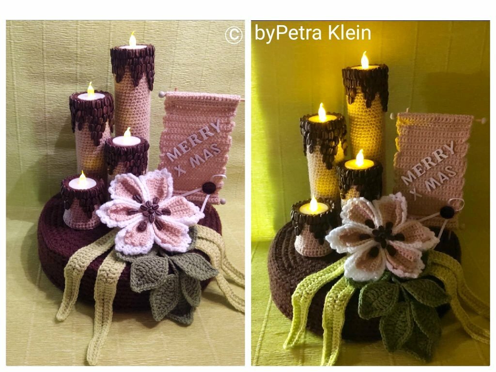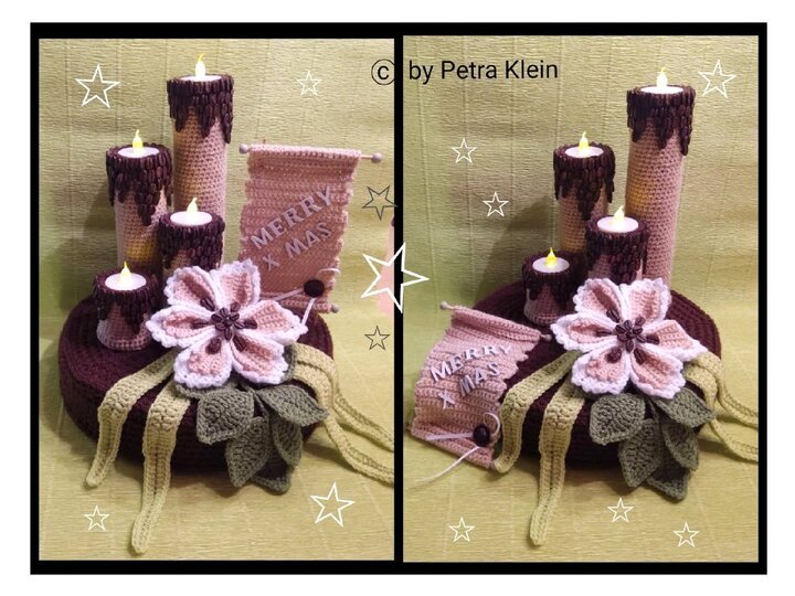Ich habe das Gesteck mit einer 2,5 Häkelnadel gearbeitet und dazu passender Wolle. Die Bodenplatte wird mit einer 4er Nadel gearbeitet und doppeltem Faden.