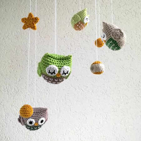 Ein gehäkeltes Mobile mit Eulen und Mond mit Sternen ist das perfekte Geburtsgeschenk um die Einrichtung im Babyzimmer abzurunden. Häkle jetzt das hübsche Eulenmobile und punkte mit der tollen Geschenkidee!