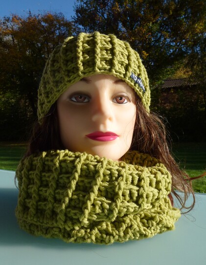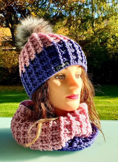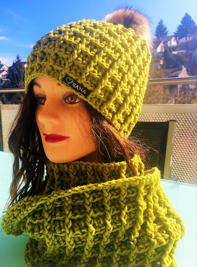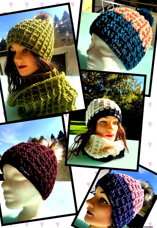 Häkelanleitung Set Mütze und Loop (5j./XS und S-L) im Waffelmuster mit Pompon/Bommel
