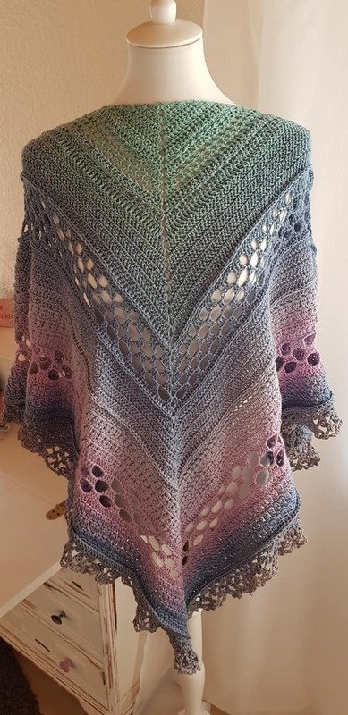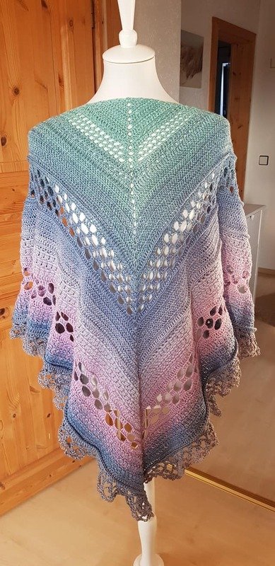 Je nach Lauflänge des Garns differiert die Größe des fertign Tuches. Mit 1.000 m (4-fädig) wurde eine Spannweite von knapp 1,90m erzielt.