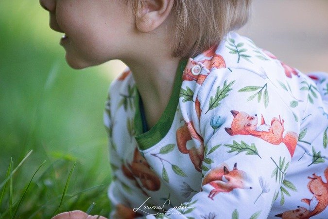 Der „Sweater LIZ“ ist ein Basic-Schnitt für einen coolen Pulli mit Halsbündchen – für die Kleinen mit Knopfleiste und für die Größeren kann das Bündchen auch durchgehend genäht werden. In der Anleitung werden beide Varianten ausführlich erklärt und es gibt auch ein Tutorial für die Versäuberung der Nackennaht mittels Jersey-Streifen. Genäht wird der Sweater LIZ beispielsweise aus Sweat, French Terry oder Jersey.