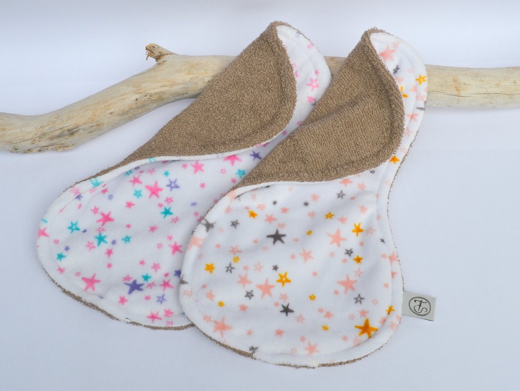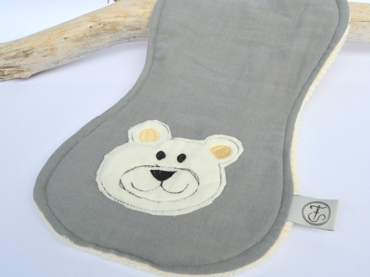 Kleines Schulterspucktuch, das auch als Schnuffeltuch Verwendung finden kann. Das Spucktuch wird komplett im Stickrahmen gestickt, mit der Nähmaschine muss lediglich die Wendeöffnung geschlossen werden. Ich empfehle noch, die Tücher nach dem Wenden einmal mit der Nähmaschine außen herum Nähfüßchen breit abzusteppen.
