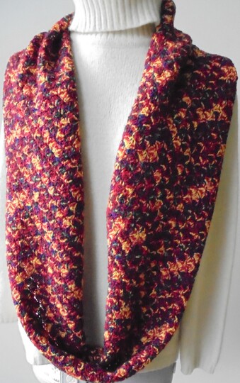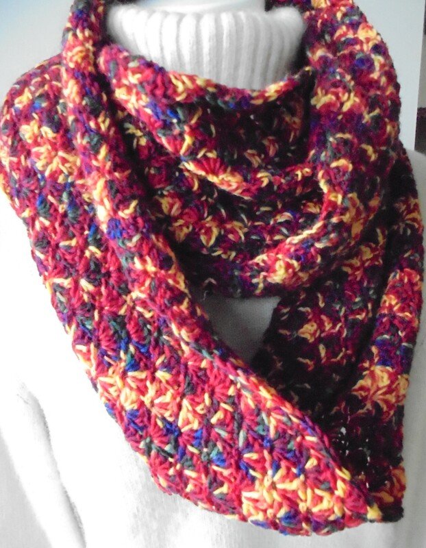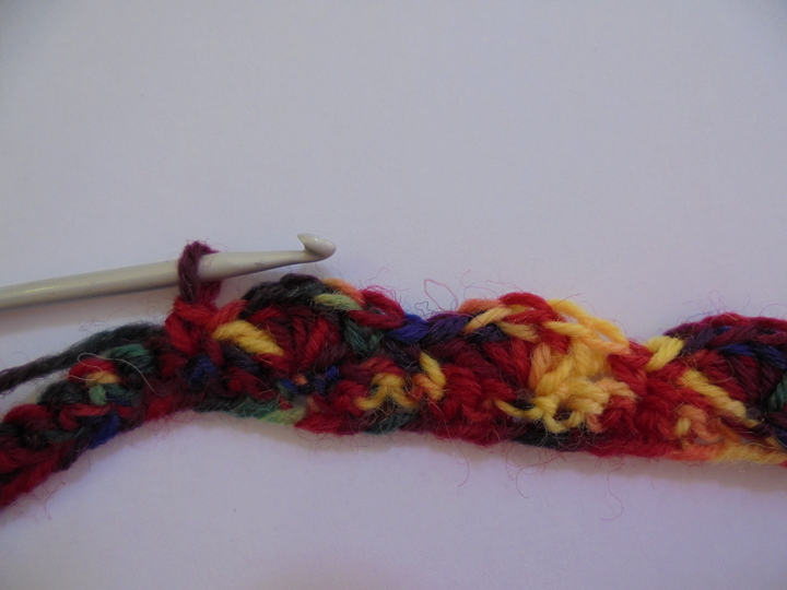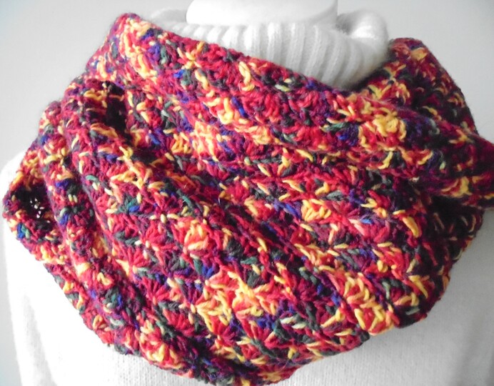 Dieser Schlauchschal wird im Muschelmuster gehäkelt. Verwendet wird eine Sockenwolle mit sehr kurzem Farbverlauf in allen Farben des Regenbogens. Das Muschelmuster bringt die bunten Farben gut zur Geltung.