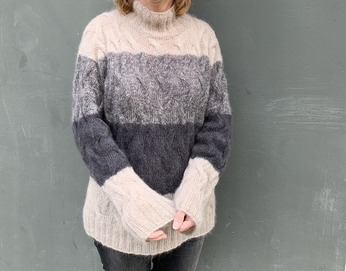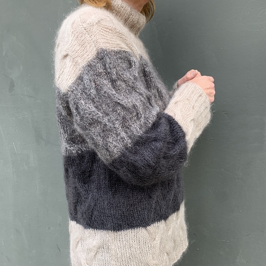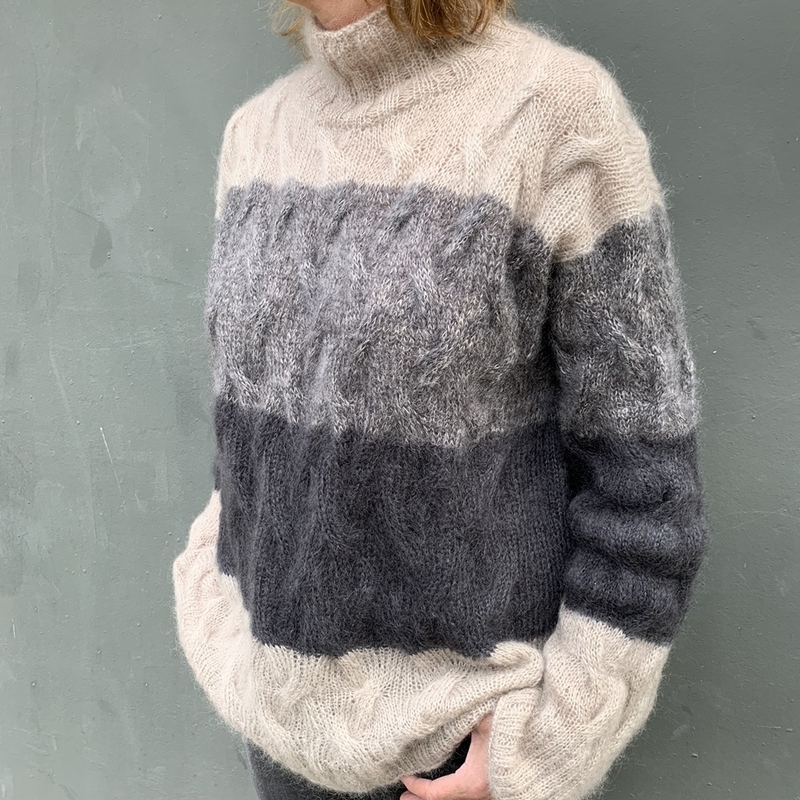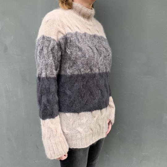 Der Pullover wirkt sportlich durch seinem lockeren Schnitt. Am Kragen und am Saum hat er breite Rippenbündchen. Für das Zopfmuster habe ich eine Zopfnadel verwendet.