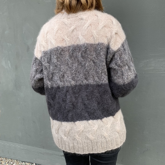 Er wird komplett mit zwei Fäden gestrickt. Das Vorderteil und das Rückenteil werden jeweils einzelnt von unten nach oben gestrickt. Nur die Ärmel werden direkt an das Vorderteil und Rückenteil gestrickt. Du kannst aber auch die Ärmel rund stricken damit du später nur die Seitenteile zusammennähen musst.