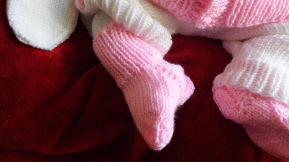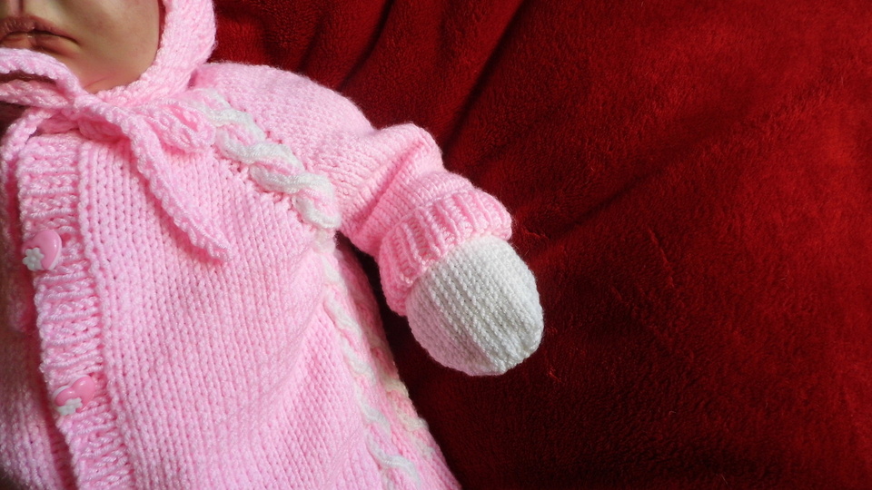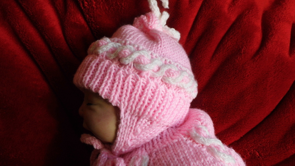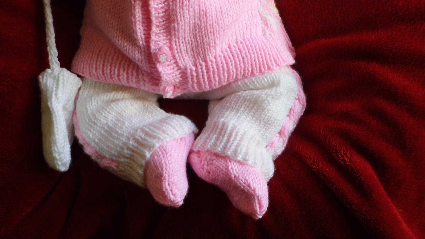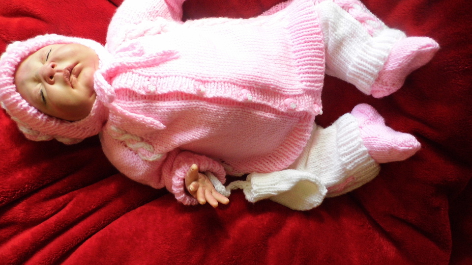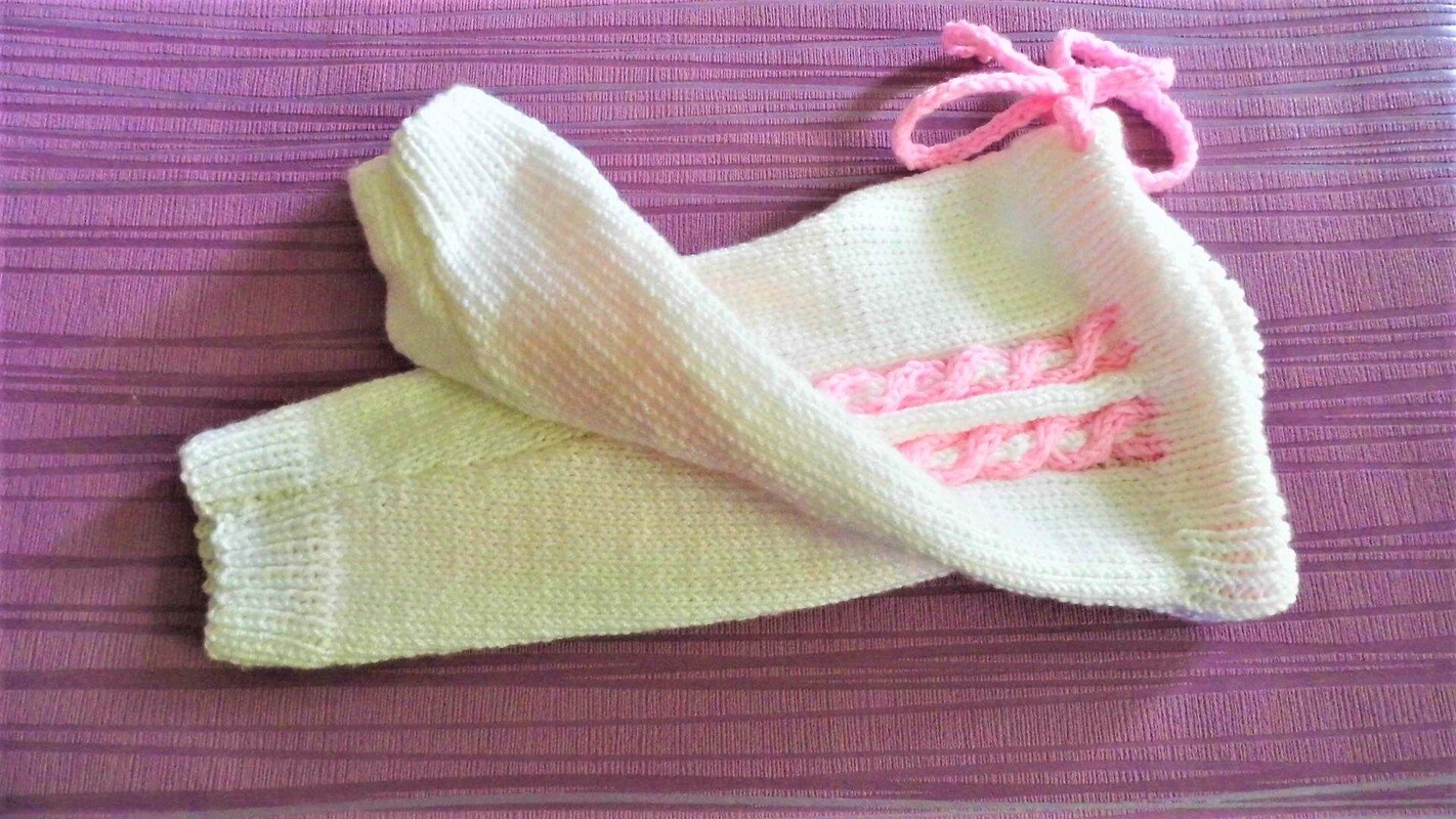 Eine Strickanleitung für ein Set für Babys, bestehend aus Jacke, Mütze,Hose ,Handschuhen und Socken.