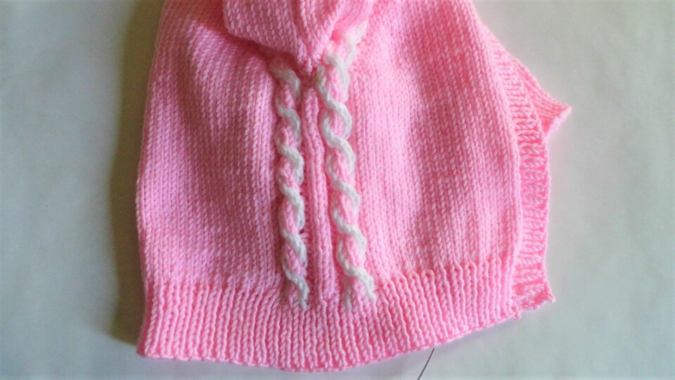 Ein farbiges Zopfmuster hebt die Raglanlinie hervor.