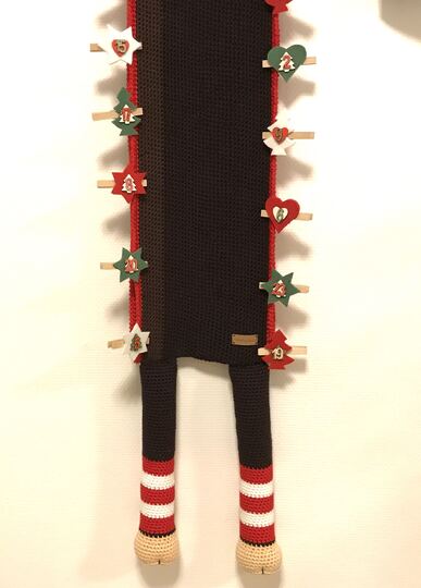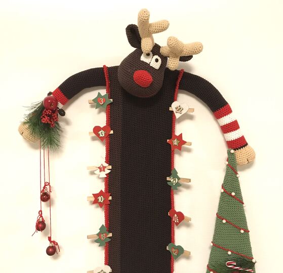 Mit dem angegebenen Garn (es wird mit doppeltem Faden gehäkelt) und der Nadelstärke 6mm wird der Kuschelschnuffelbande Rentier Adventskalender Knut ca.175cm groß.