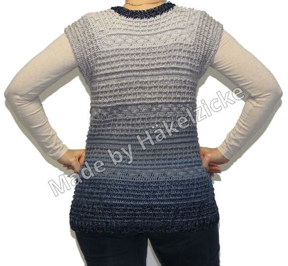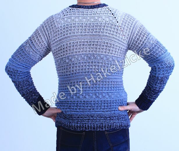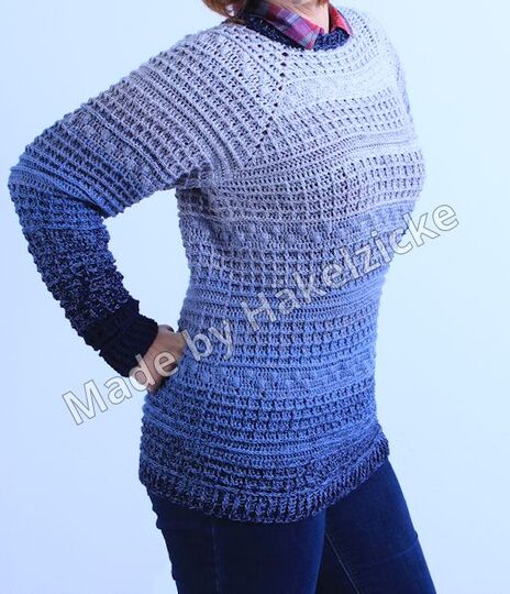 Das Muster ist recht einfach gehalten, mit klaren Linien und Strukturen, aber trotzdem abwechslungsreich zu Arbeiten. Gehäkelt wird hier mit Raglan in Runden von oben, so daß die Größe ganz einfach beim Arbeiten angepasst werden kann. Egal welche Größe Ihr braucht - das Modell läßt sich leicht anpassen: einfach ein paar Runden mehr oder weniger im Brustbereich häkeln.